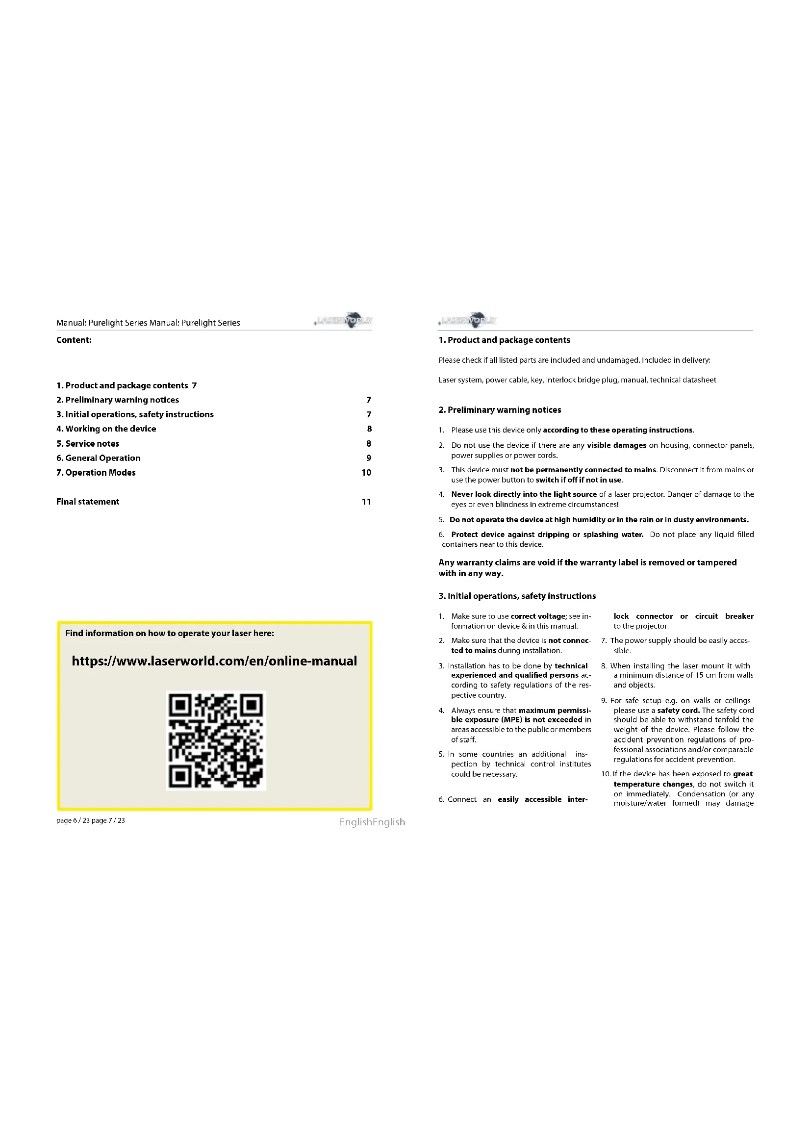 This laser system can be operated in many dierent operation modes. Information, videos and tutorials are available online! Find information on how to operate your laser here: https://www.laserworld.com/en/online-manual Final statement Laserworld products are tested and product packaging is inspected before leaving our warehouse. Users must to follow the local safety regulations and warnings within this manual and adhere to any regulations within its place of use. Damages through inappropriate use will void any liability or warranty of our products. Due to continual product developments, please check for the latest update of this product manual at www.laserworld.com. If you do have any further questions, then please contact your dealer/place of purchase or use our contact section on our website. For service issues, please contact your dealer/place of purchase and ensure only genuine Laserworld spare parts are used in any service repairs. Errors and Omissions excepted and products are subject to change. Laserworld (Switzerland) AG Kreuzlingerstrasse 5 8574 Lengwil Switzerland Board of Directors: Martin Werner Registered oce: 8574 Lengwil / Switzerland Company number: CH-440.3.020.548-6 Commercial Registry Kanton Thurgau CEO: Martin Werner VAT no. (Switzerland): 683 180 UID (Switzerland): CHE-113.954.889 VAT no. (Germany): DE 258030001 WEEE-Reg.-No. (Germany): DE 90759352 www.laserworld.com info@laserworld.com representative according to EMVG: tarm laser technologies tlt GmbH & Co. KG Lindenallee 27 D-44625 HerneAnleitung: Purelight Serie Seite 13 / 23 Anleitung: Purelight Serie Seite 12 / 23 DeutschDeutsch Weitere Informationen zum Betrieb Ihres Gerätes nden Sie hier: https://www.laserworld.com/de/online-anleitung Content: