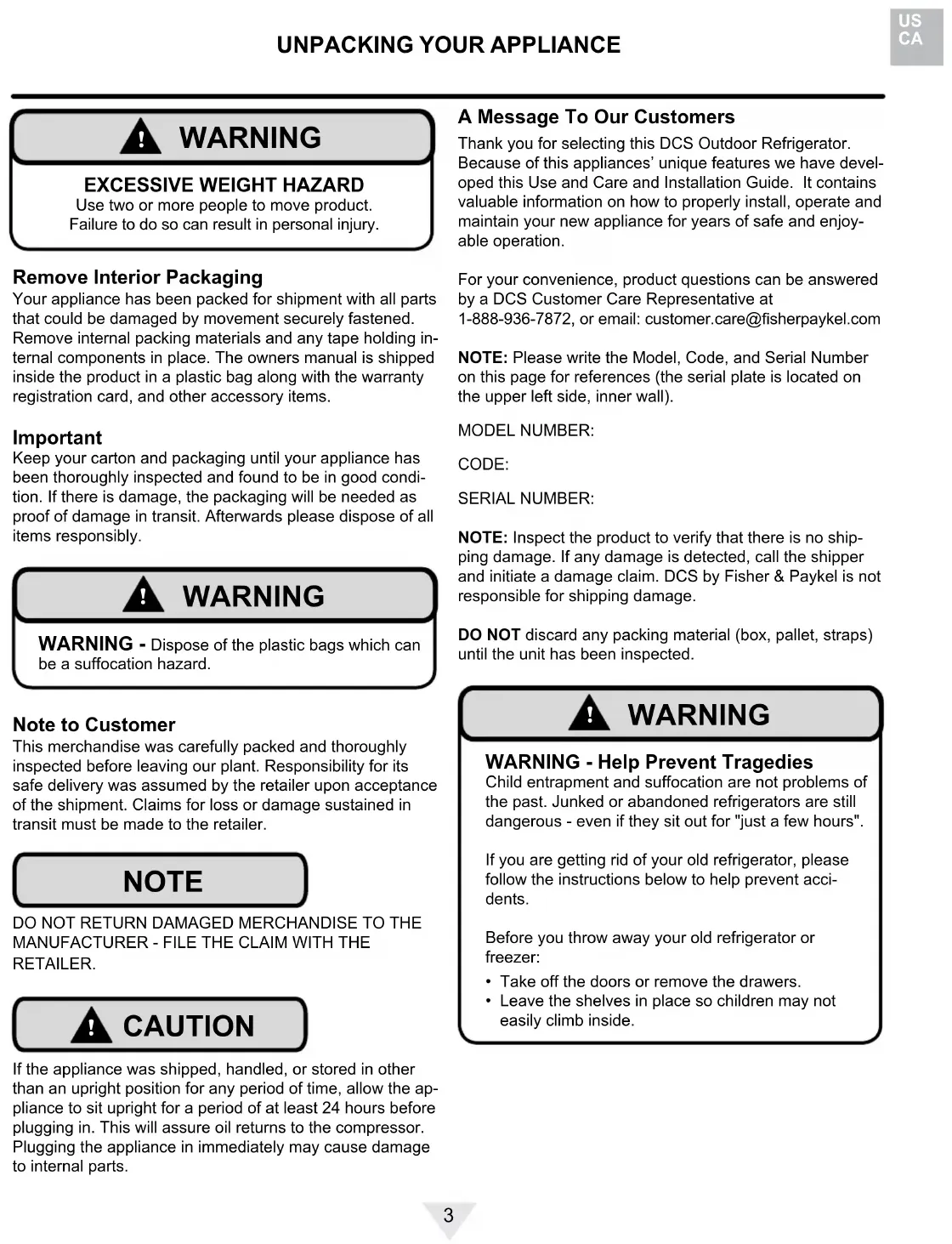 WARNING WARNING - You can be killed or seriously injured if you do not follow these instructions. CAUTION-Hazards or unsafe practices which could re- sult in personal injury or property / product damage. NOTE-Important information to help assure a problem free installation and operation. CONTENTS State of California Proposition 65 Warnings:WARNING: This product contains one or more chemicals known to the State of California to cause cancer.WARNING: This product contains one or more chemicals known to the State of California to cause birth defects or other reproductive harm.3 A Message To Our Customers Thank you for selecting this DCS Outdoor Refrigerator. Because of this appliances’ unique features we have devel-oped this Use and Care and Installation Guide. It contains valuable information on how to properly install, operate and maintain your new appliance for years of safe and enjoy-able operation.For your convenience, product questions can be answered by a DCS Customer Care Representative at 1-888-936-7872, or email: customer.care@sherpaykel.comNOTE: Please write the Model, Code, and Serial Number on this page for references (the serial plate is located on the upper left side, inner wall).MODEL NUMBER: CODE:SERIAL NUMBER:NOTE: Inspect the product to verify that there is no ship-ping damage. If any damage is detected, call the shipper and initiate a damage claim. DCS by Fisher & Paykel is not responsible for shipping damage.DO NOT discard any packing material (box, pallet, straps) until the unit has been inspected.