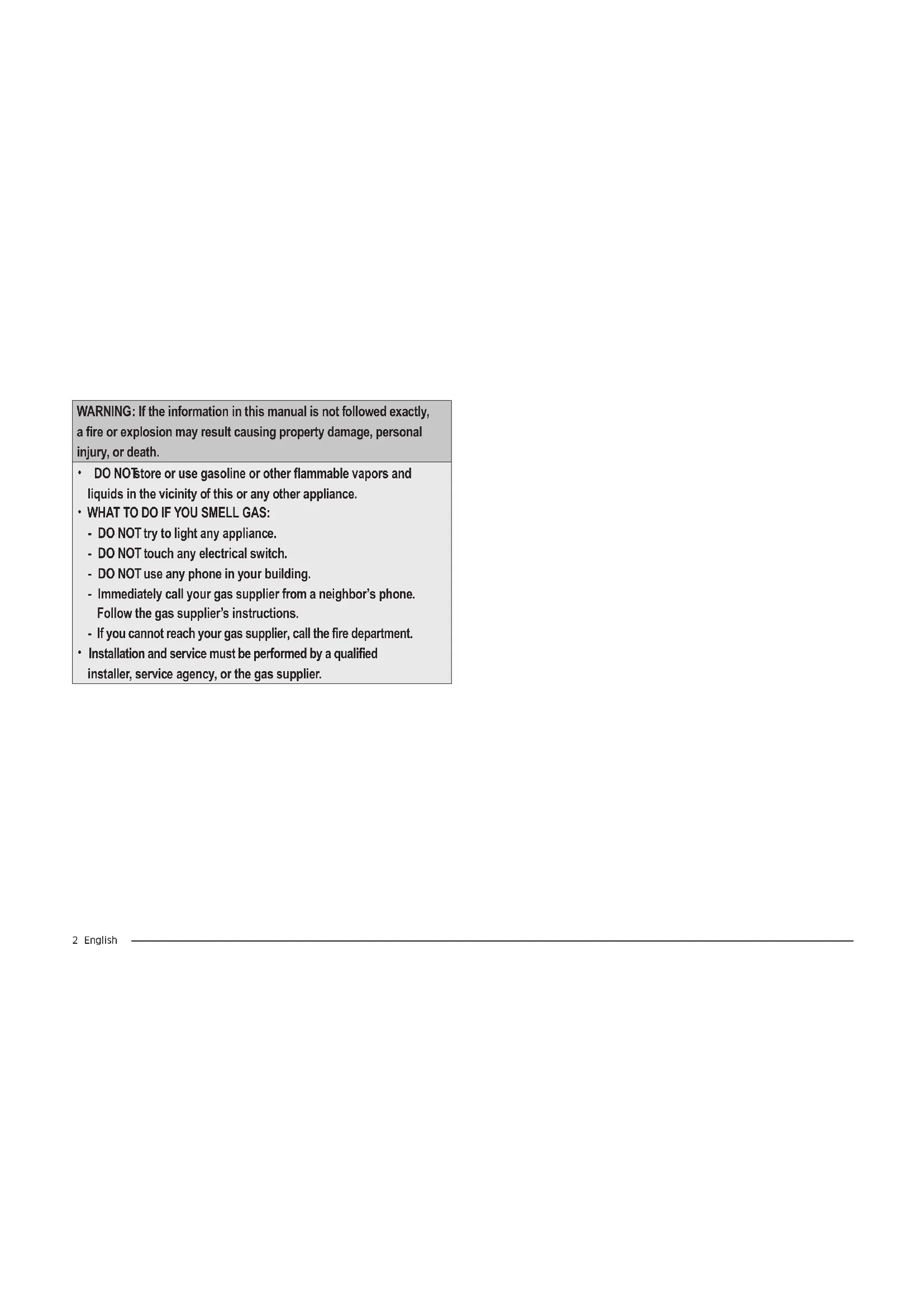 - WHAT TO DO IF YOU SMELL GAS: - DO NOT try to light any appliance. - DO NOT touch any electrical switch. - DO NOT use any phone in your building. - Immediately call your gas supplier from a neighbor’s phone. Follow the gas supplier’s instructions. If you cannot reach your gas supplier, call the fire department. Installation and service must be performed by a qualified