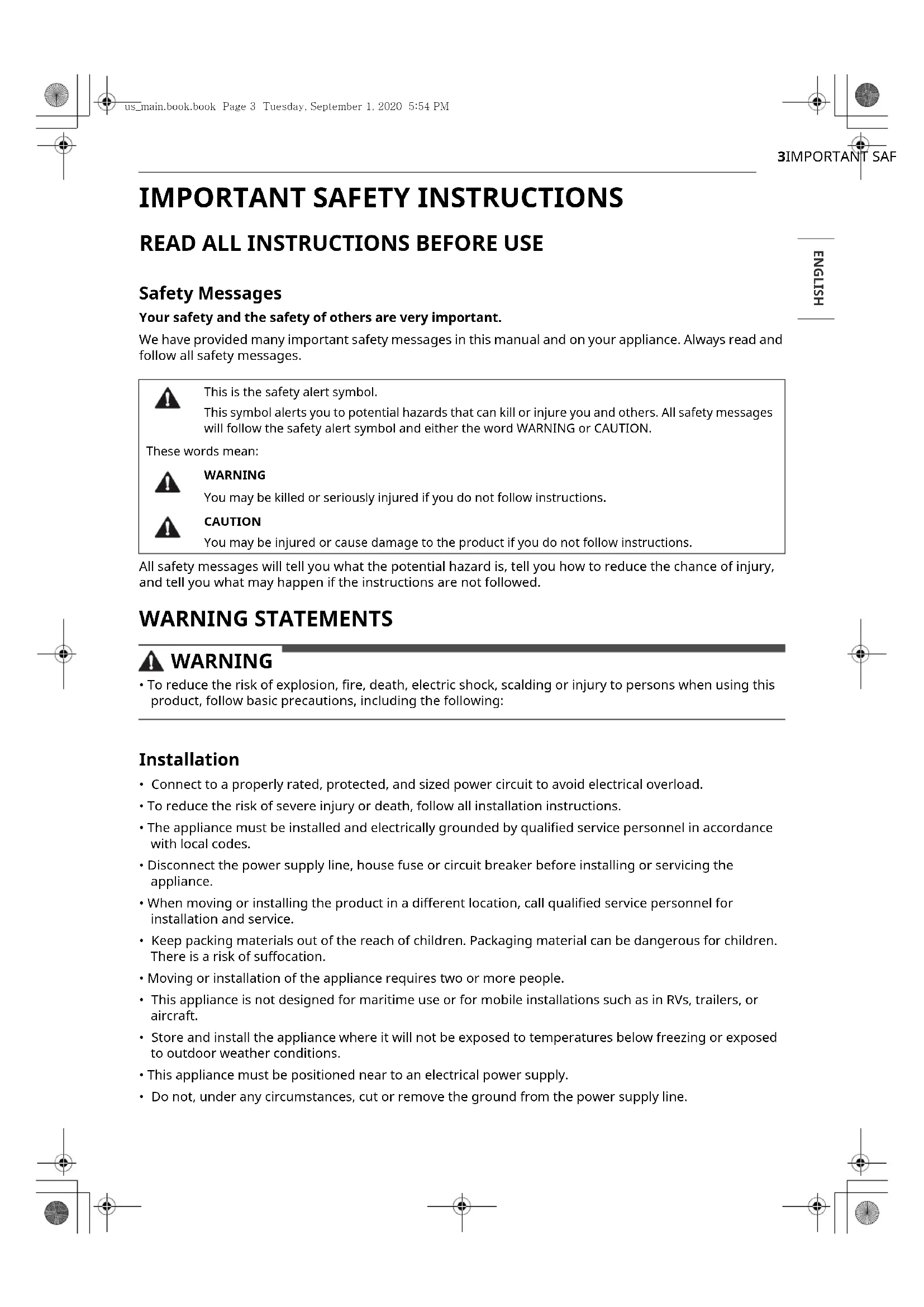 - Do not, under any circumstances, cut or remove the ground from the power supply line. This is the safety alert symbol.This symbol alerts you to potential hazards that can kill or injure you and others. All safety messages will follow the safety alert symbol and either the word WARNING or CAUTION. These words mean:WARNINGYou may be killed or seriously injured if you do not follow instructions.CAUTIONYou may be injured or cause damage to the product if you do not follow instructions.us_main.book.book Page 3 Tuesday, September 1, 2020 5:54 PM4 IMPORTANT SAFETY INSTRUCTIONS
