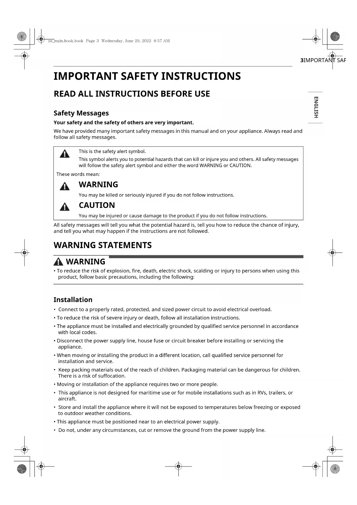 - Do not, under any circumstances, cut or remove the ground from the power supply line. This is the safety alert symbol.This symbol alerts you to potential hazards that can kill or injure you and others. All safety messages will follow the safety alert symbol and either the word WARNING or CAUTION. These words mean: WARNING You may be killed or seriously injured if you do not follow instructions. CAUTION You may be injured or cause damage to the product if you do not follow instructions.us_main.book.book Page 3 Wednesday, June 29, 2022 8:57 AM4 IMPORTANT SAFETY INSTRUCTIONS