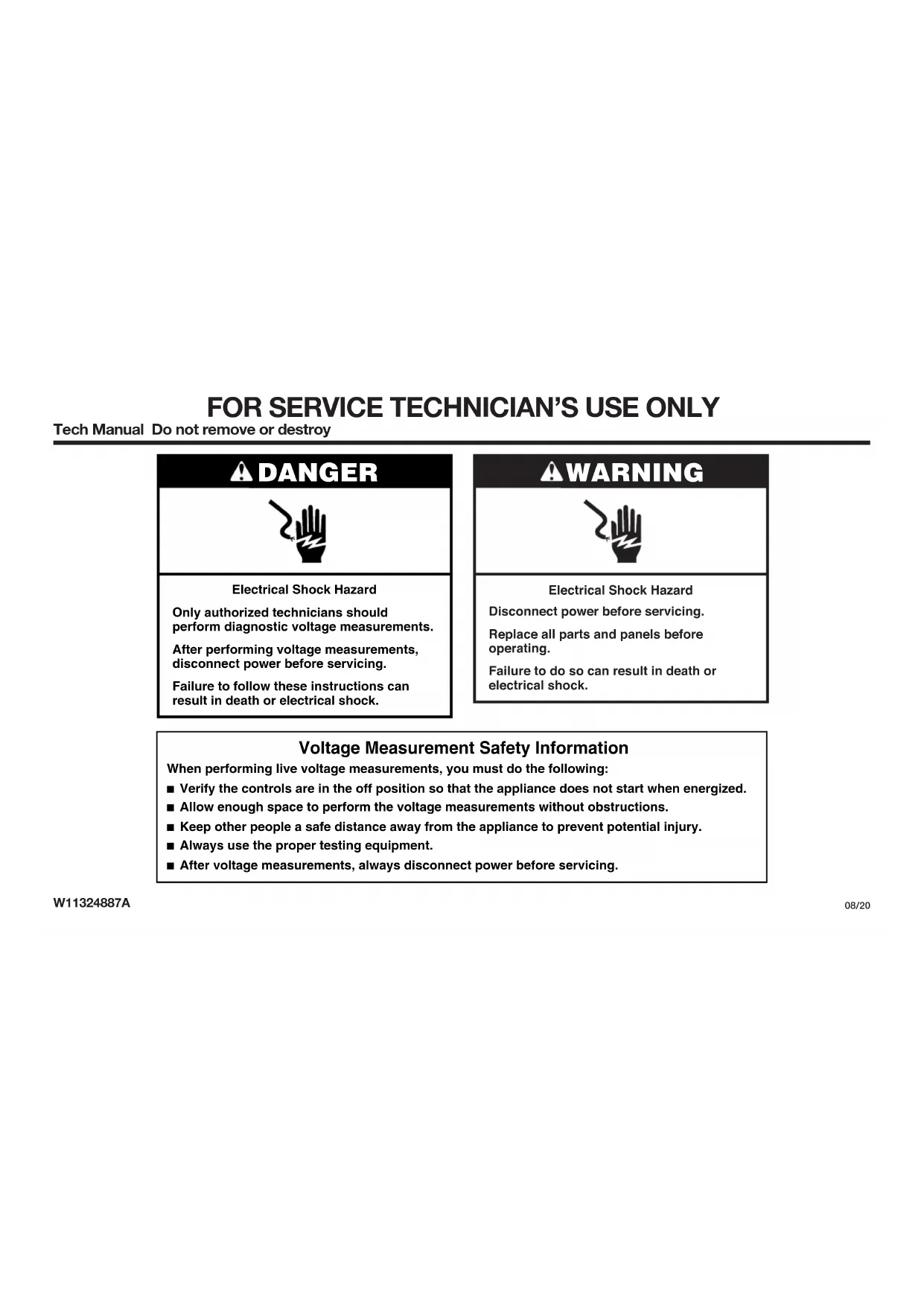 Tech Manual Do not remove or destroy W11324887A 08/20 WARNING Electrical Shock Hazard Disconnect power before servicing. Replace all parts and panels before operating. Failure to do so can result in death or electrical shock. DANGER Electrical Shock Hazard Only authorized technicians should perform diagnostic voltage measurements. After performing voltage measurements, disconnect power before servicing. Failure to follow these instructions can result in death or electrical shock. Voltage Measurement Safety Information When performing live voltage measurements, you must do the following: ■ Verify the controls are in the off position so that the appliance does not start when energized. ■ Allow enough space to perform the voltage measurements without obstructions.■ Keep other people a safe distance away from the appliance to prevent potential injury.■ Always use the proper testing equipment.■ After voltage measurements, always disconnect power before servicing.FOR SERVICE TECHNICIAN’S USE ONLY