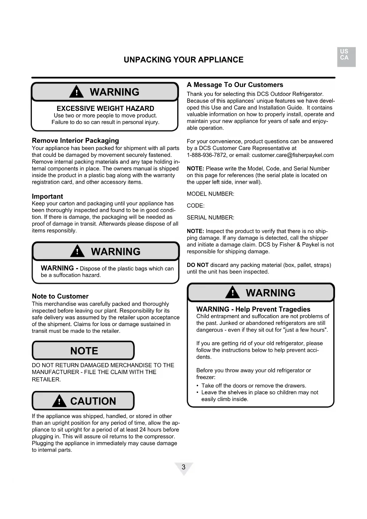 WARNING WARNING - You can be killed or seriously injured if you do not follow these instructions. CAUTION-Hazards or unsafe practices which could re- sult in personal injury or property / product damage. NOTE-Important information to help assure a problem free installation and operation. CONTENTS State of California Proposition 65 Warnings:WARNING: This product contains one or more chemicals known to the State of California to cause cancer.WARNING: This product contains one or more chemicals known to the State of California to cause birth defects or other reproductive harm.3 A Message To Our Customers Thank you for selecting this DCS Outdoor Refrigerator. Because of this appliances’ unique features we have devel-oped this Use and Care and Installation Guide. It contains valuable information on how to properly install, operate and maintain your new appliance for years of safe and enjoy-able operation.For your convenience, product questions can be answered by a DCS Customer Care Representative at 1-888-936-7872, or email: customer.care@sherpaykel.comNOTE: Please write the Model, Code, and Serial Number on this page for references (the serial plate is located on the upper left side, inner wall).MODEL NUMBER: CODE:SERIAL NUMBER:NOTE: Inspect the product to verify that there is no ship-ping damage. If any damage is detected, call the shipper and initiate a damage claim. DCS by Fisher & Paykel is not responsible for shipping damage.DO NOT discard any packing material (box, pallet, straps) until the unit has been inspected.