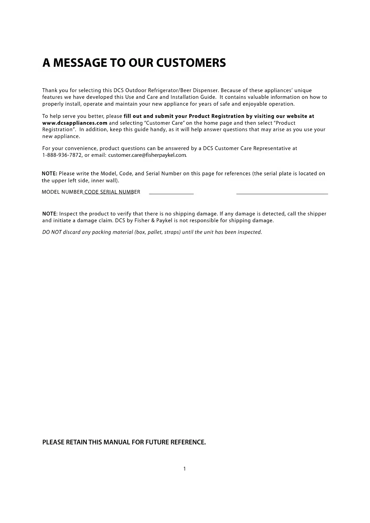 NOTE: Inspect the product to verify that there is no shipping damage. If any damage is detected, call the shipper and initiate a damage claim. DCS by Fisher & Paykel is not responsible for shipping damage. DO NOT discard any packing material (box, pallet, straps) until the unit has been inspected. PLEASE RETAIN THIS MANUAL FOR FUTURE REFERENCE.