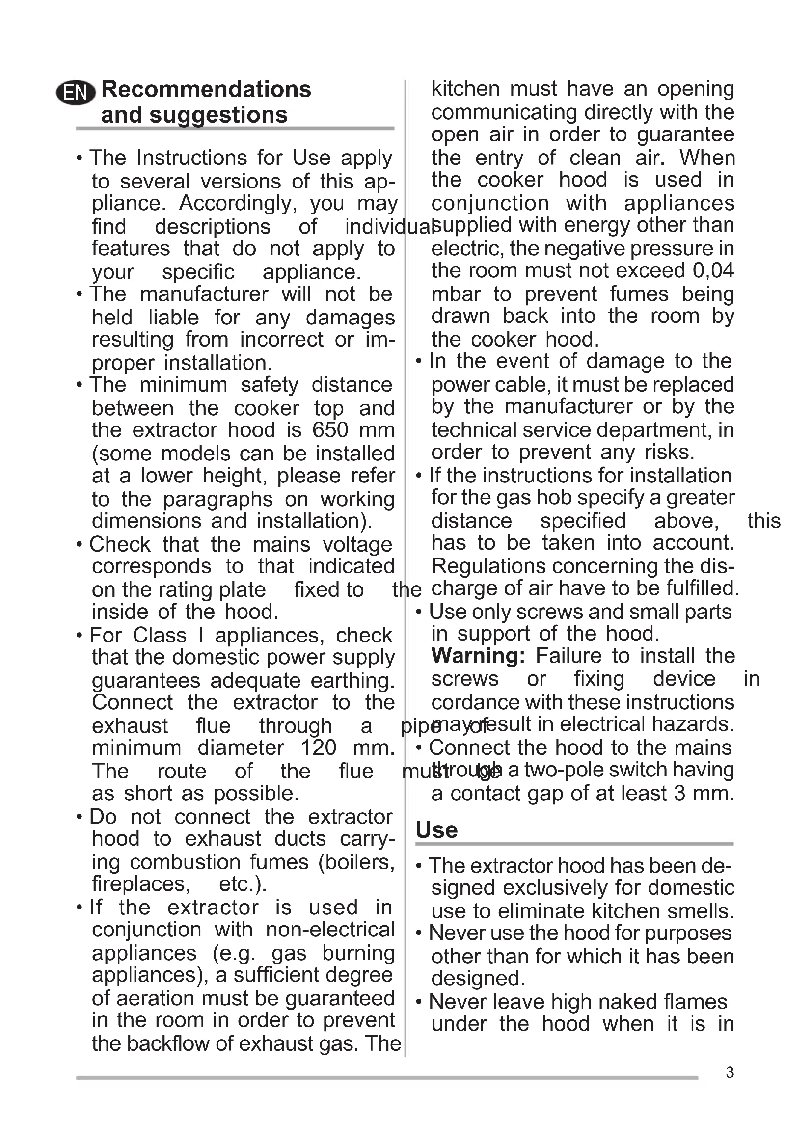 - If the extractor is used in conjunction with non-electrical appliances (e.g. gas burning appliances),asufcientdegree of aeration must be guaranteed in the room in order to prevent thebackowofexhaustgas.The kitchen must have an opening communicating directly with the open air in order to guarantee the entry of clean air. When the cooker hood is used in conjunction with appliances supplied with energy other than electric, the negative pressure in the room must not exceed 0,04 mbar to prevent fumes being drawn back into the room by the cooker hood.