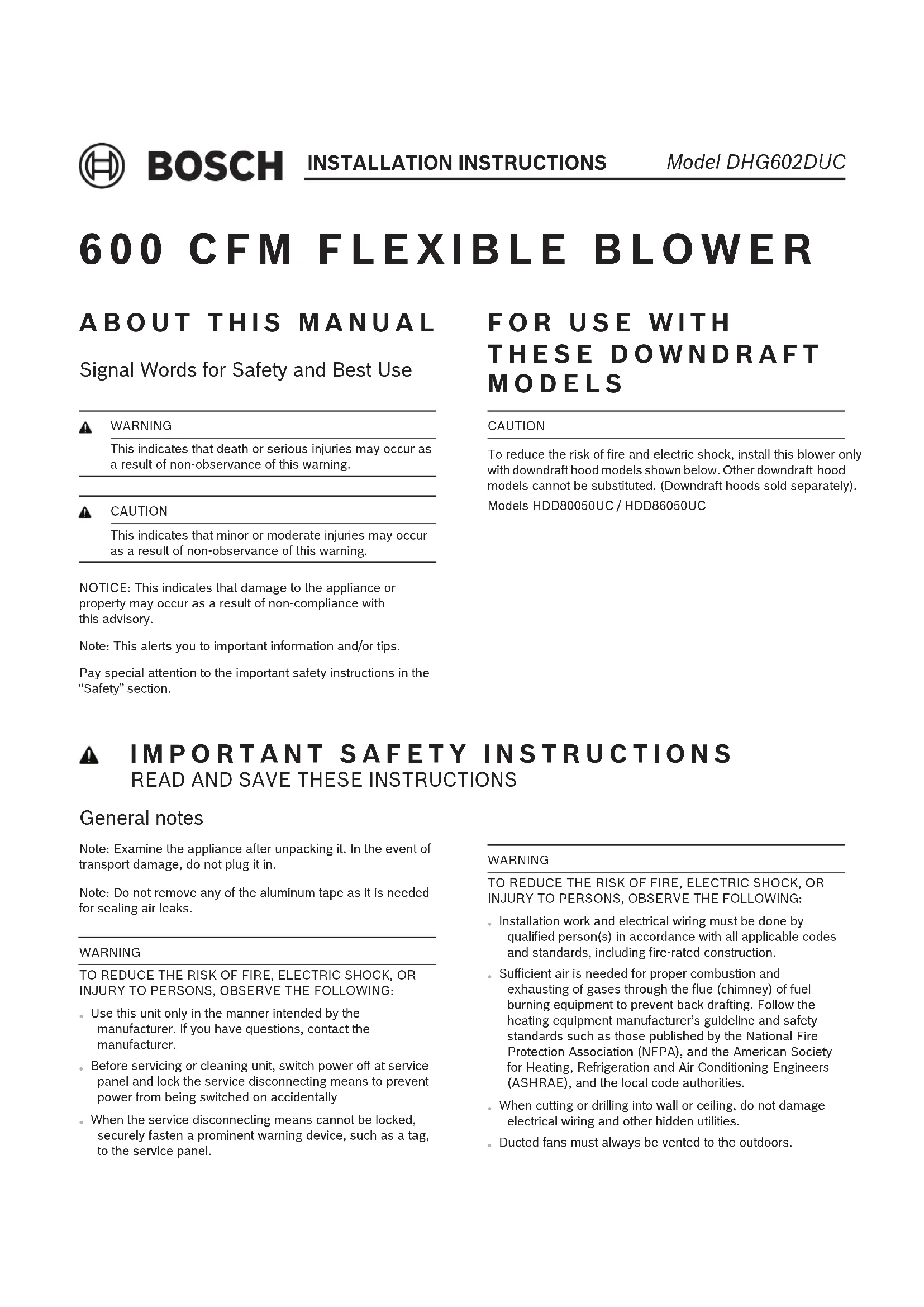 Ducted fans must always be vented to the outdoors. CAUTION To reduce the risk of re and electric shock, install this blower only with downdraft hood models shown below. Other downdraft hood models cannot be substituted. (Downdraft hoods sold separately). Models HDD80050UC / HDD86050UC