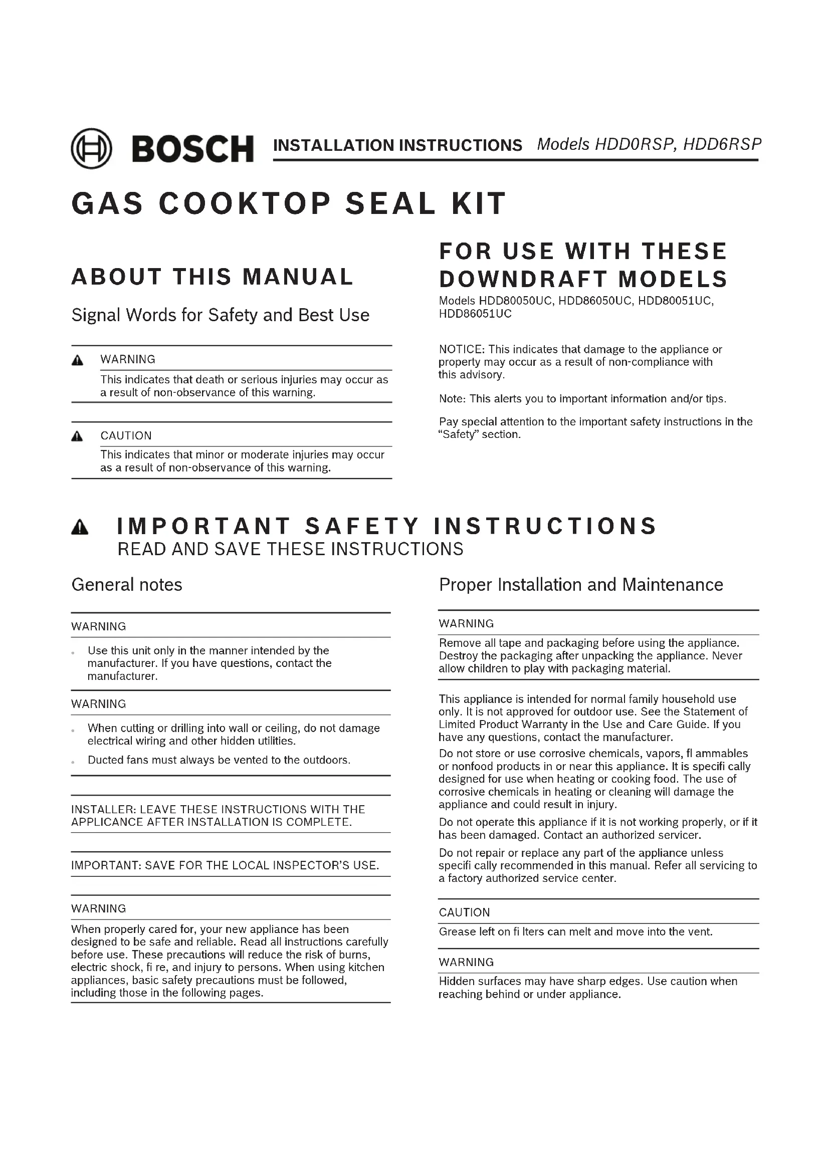 Before Calling Service See the Use and Care Manual for troubleshooting information. Refer to the “Statement of Limited Product Warranty”. To reach a service representative, see the contact information at the front of the manual. Please be prepared with the information printed on your product data label when calling. Data Label The data label shows the model and serial number. Refer to the data label on the appliance when requesting service. The data label can be found on the front / lower / left of the downdraft housing. To avoid having to search for each piece of information when calling, you can enter the four items needed in the spaces below. Model No. Serial No. Date of Purchase Customer Service No. Keep your invoice or escrow papers for warranty validation if service is needed. Service We realize that you have made a considerable investment in your kitchen. We are dedicated to supporting you and your appliance so that you have many years of creative cooking. Please don’t hesitate to contact our Customer Support Department if you have any questions of in the unlikely event that you Bosch