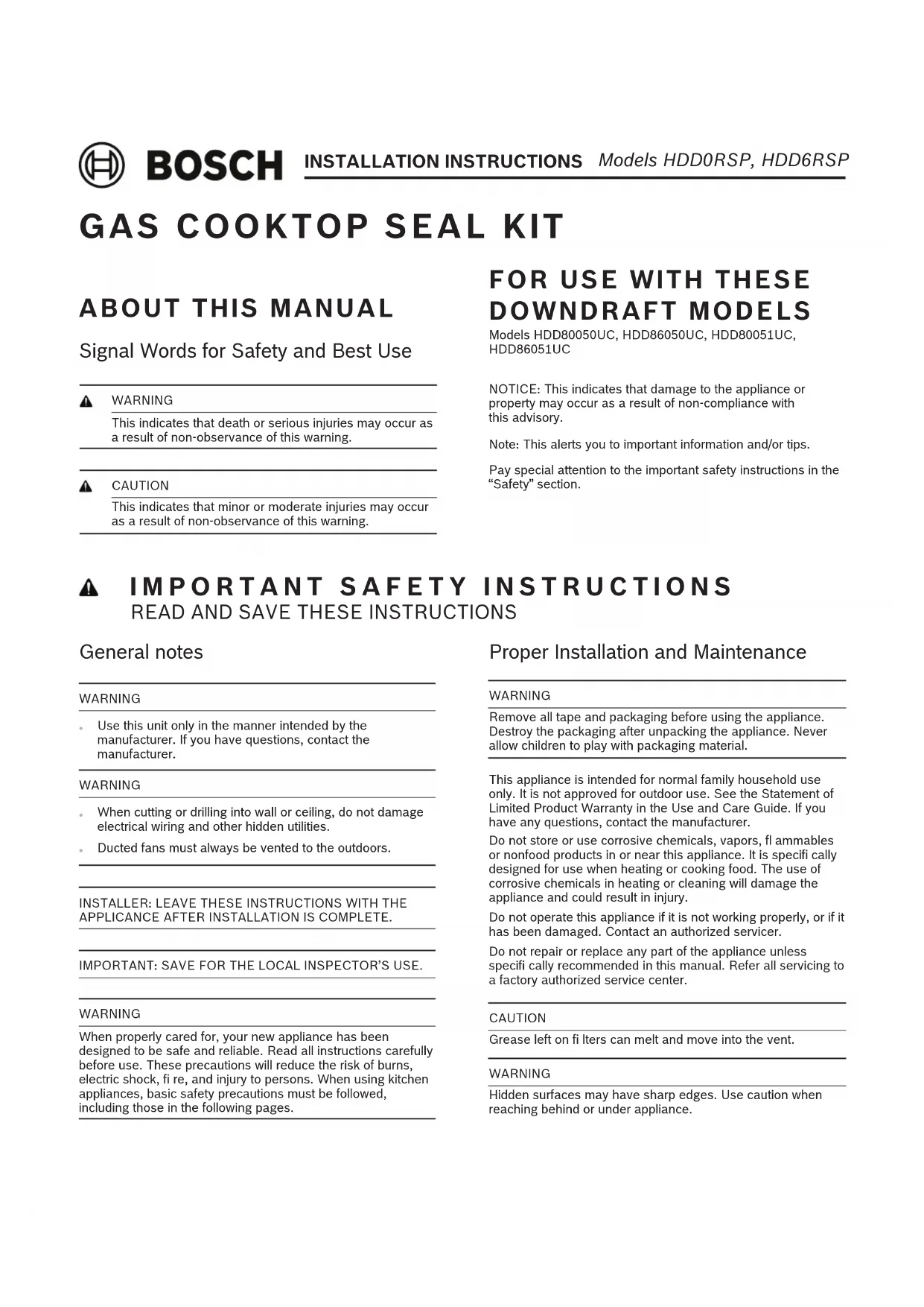 FOR USE WITH THESE DOWNDRAFT MODELS