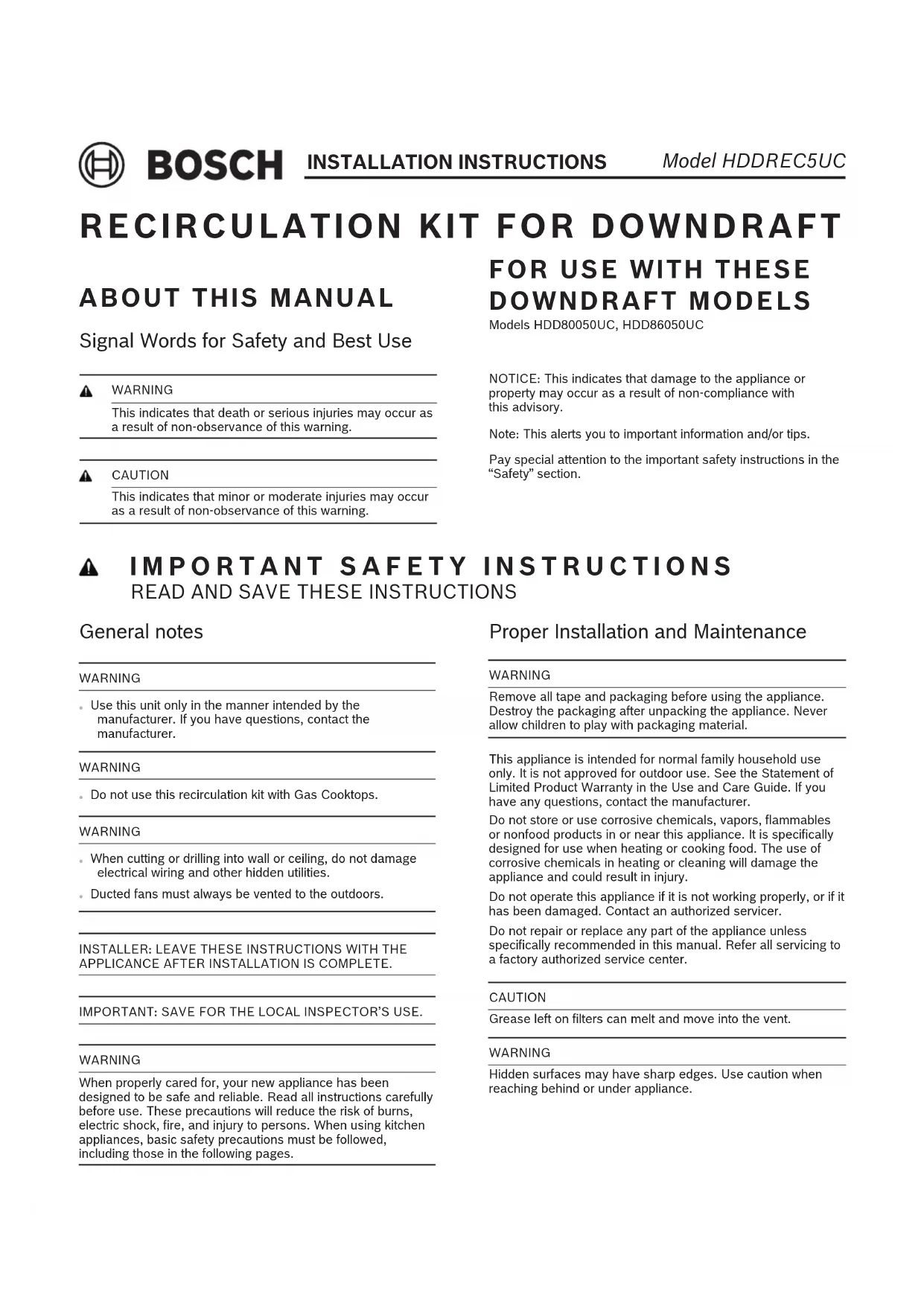 DOWNDRAFT MODELS Models HDD80050UC, HDD86050UC2 Fire Safety WARNING Use this appliance only for its intended use as described in this manual. Always have a working smoke detector near the kitchen. In the event that personal clothing or hair catches re, drop and roll immediately to extinguish ames. Have an appropriate re extinguisher available, nearby, highly visible and easily accessible near the appliance. Smother ames from food res other than grease res with baking soda. Never use water on cooking res. WARNING TO REDUCE THE RISK OF INJURY TO PERSONS IN THE EVENT OF A RANGE TOP GREASE FIRE, OBSERVE THE FOLLOWING: