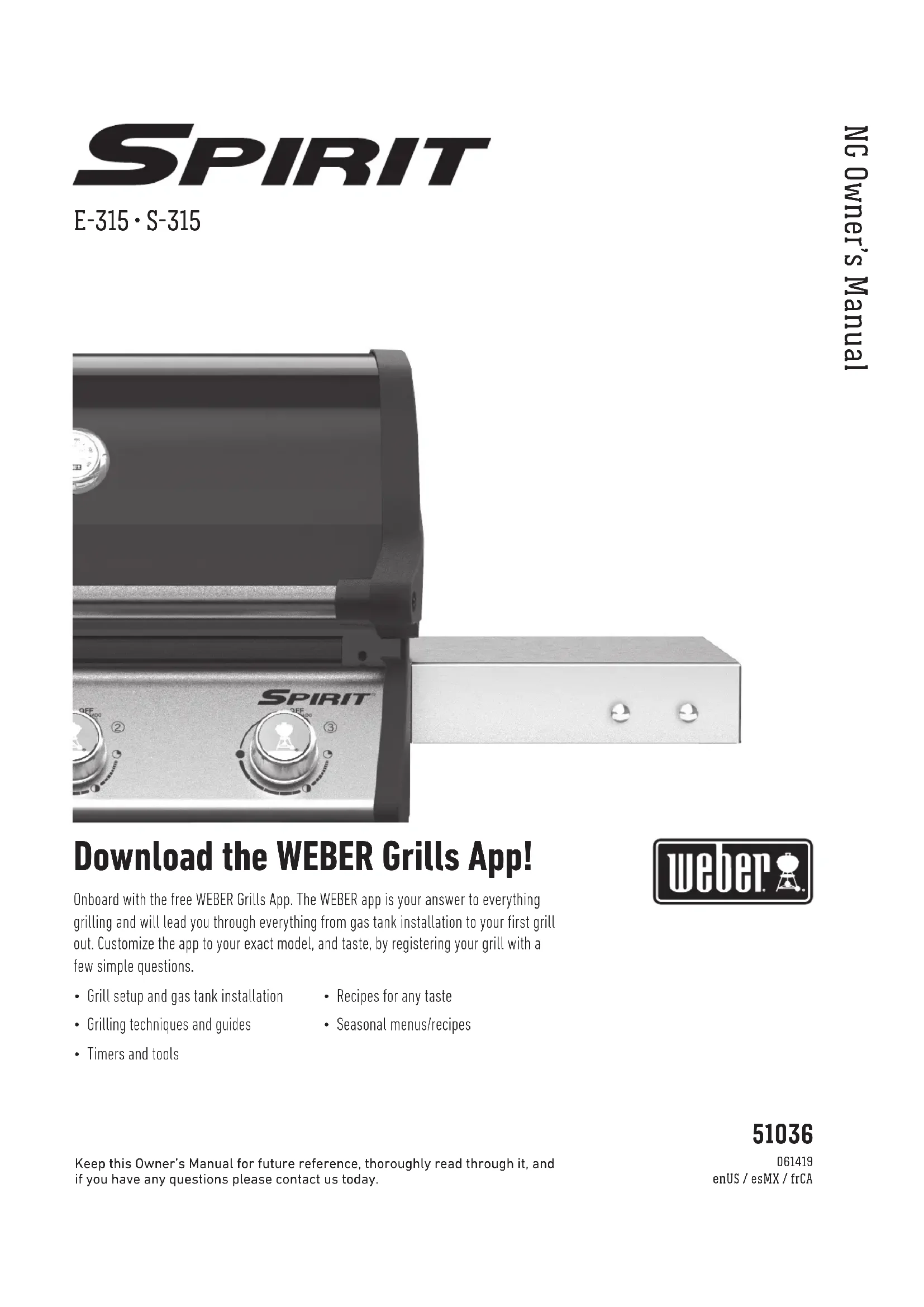 061419enUS / esMX / frCAKeep this Owner’s Manual for future reference, thoroughly read through it, and if you have any questions please contact us today. Download the WEBER Grills App! Onboard with the free WEBER Grills App. The WEBER app is your answer to everything grilling and will lead you through everything from gas tank installation to your first grill out. Customize the app to your exact model, and taste, by registering your grill with a few simple questions.