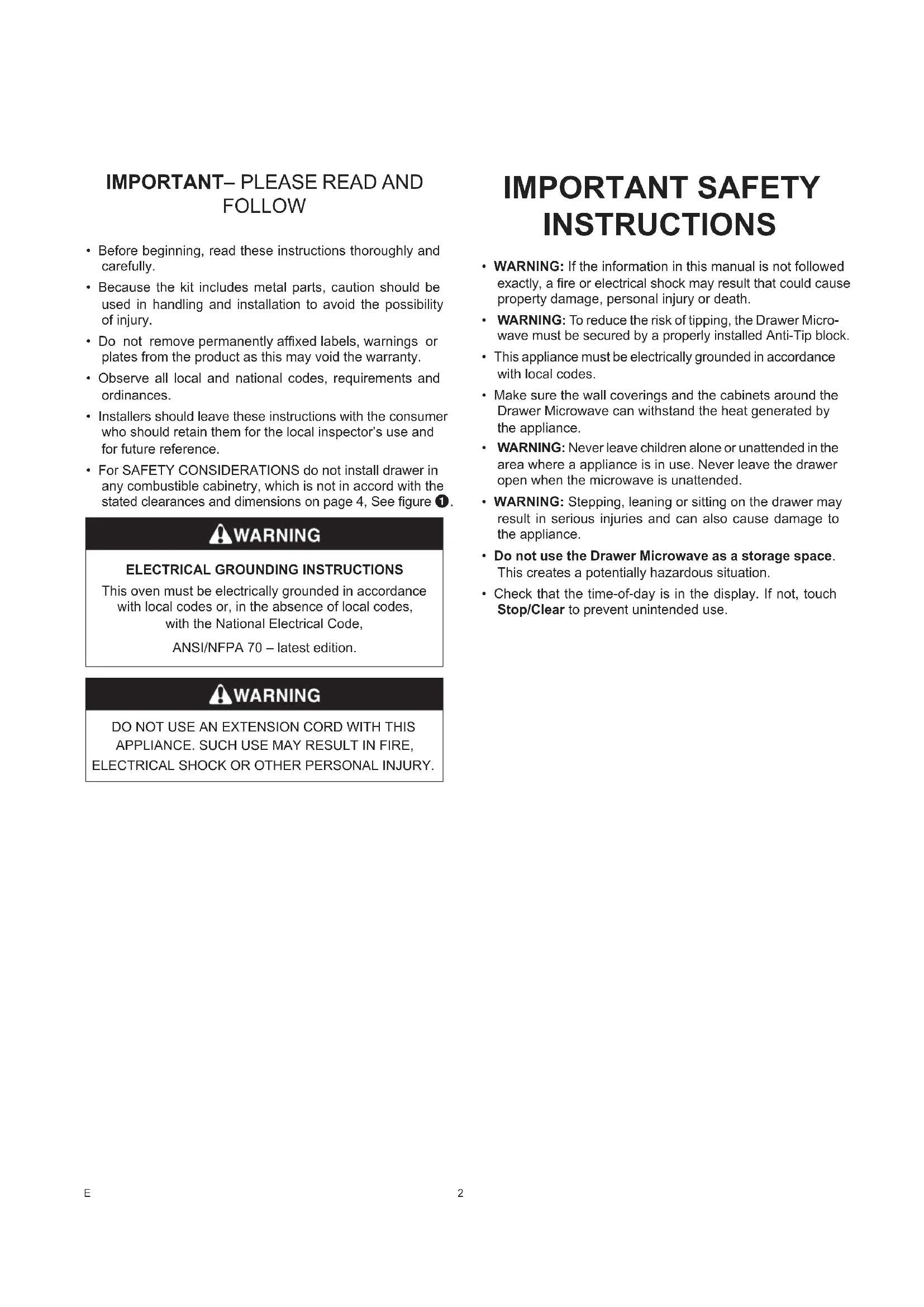 - WARNING: To reduce the risk of tipping, the Drawer Micro- wave must be secured by a properly installed Anti-Tip block.