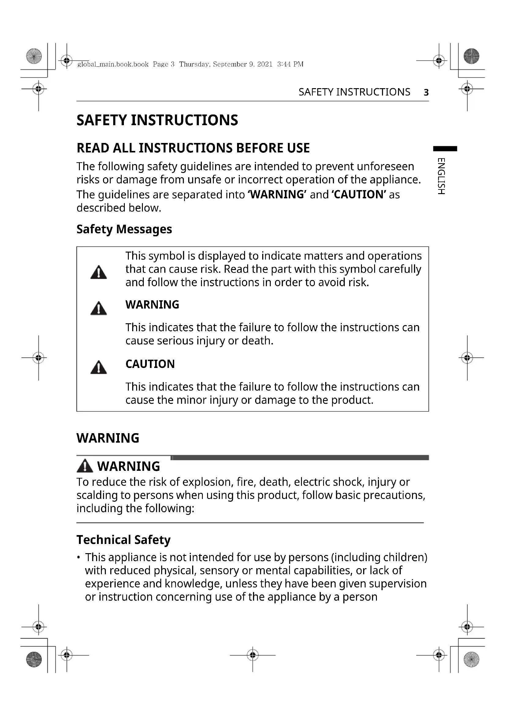 - This appliance is not intended for use by persons (including children) with reduced physical, sensory or mental capabilities, or lack of experience and knowledge, unless they have been given supervision or instruction concerning use of the appliance by a person This symbol is displayed to indicate matters and operations that can cause risk. Read the part with this symbol carefully and follow the instructions in order to avoid risk. WARNING This indicates that the failure to follow the instructions can cause serious injury or death. CAUTION This indicates that the failure to follow the instructions can cause the minor injury or damage to the product. global_main.book.book Page 3 Thursday, September 9, 2021 3:44 PM4 SAFETY INSTRUCTIONS responsible for their safety. Children should be supervised to ensure that they do not play with the appliance.