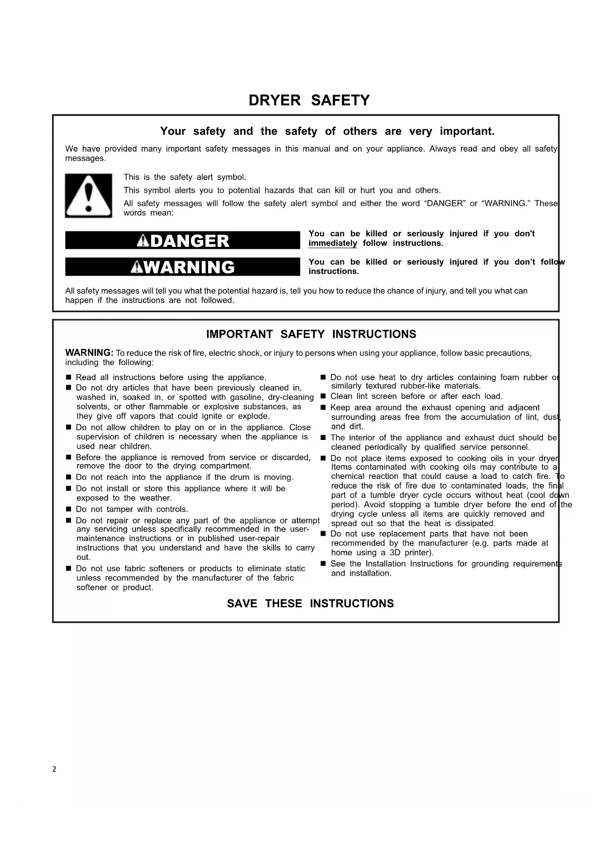 WARNING: To reduce the risk of fire, electric shock, or injury to persons when using your appliance, follow basic precautions, including the following: Read all instructions before using the appliance. Do not dry articles that have been previously cleaned in, washed in, soaked in, or spotted with gasoline, dry-cleaning solvents, or other flammable or explosive substances, as they give off vapors that could ignite or explode. Do not allow children to play on or in the appliance. Close supervision of children is necessary when the appliance is used near children. Before the appliance is removed from service or discarded, remove the door to the drying compartment. Do not reach into the appliance if the drum is moving. Do not install or store this appliance where it will be exposed to the weather. Do not tamper with controls. Do not repair or replace any part of the appliance or attempt any servicing unless specifically recommended in the user- maintenance instructions or in published user-repair instructions that you understand and have the skills to carry out. Do not use fabric softeners or products to eliminate static unless recommended by the manufacturer of the fabric softener or product. Do not use heat to dry articles containing foam rubber or similarly textured rubber-like materials. Clean lint screen before or after each load. Keep area around the exhaust opening and adjacent surrounding areas free from the accumulation of lint, dust, and dirt. The interior of the appliance and exhaust duct should be cleaned periodically by qualified service personnel. Do not place items exposed to cooking oils in your dryer. Items contaminated with cooking oils may contribute to a chemical reaction that could cause a load to catch fire. To reduce the risk of fire due to contaminated loads, the final part of a tumble dryer cycle occurs without heat (cool down period). Avoid stopping a tumble dryer before the end of the drying cycle unless all items are quickly removed and spread out so that the heat is dissipated. Do not use replacement parts that have not been recommended by the manufacturer (e.g. parts made at home using a 3D printer). See the Installation Instructions for grounding requirements and installation.