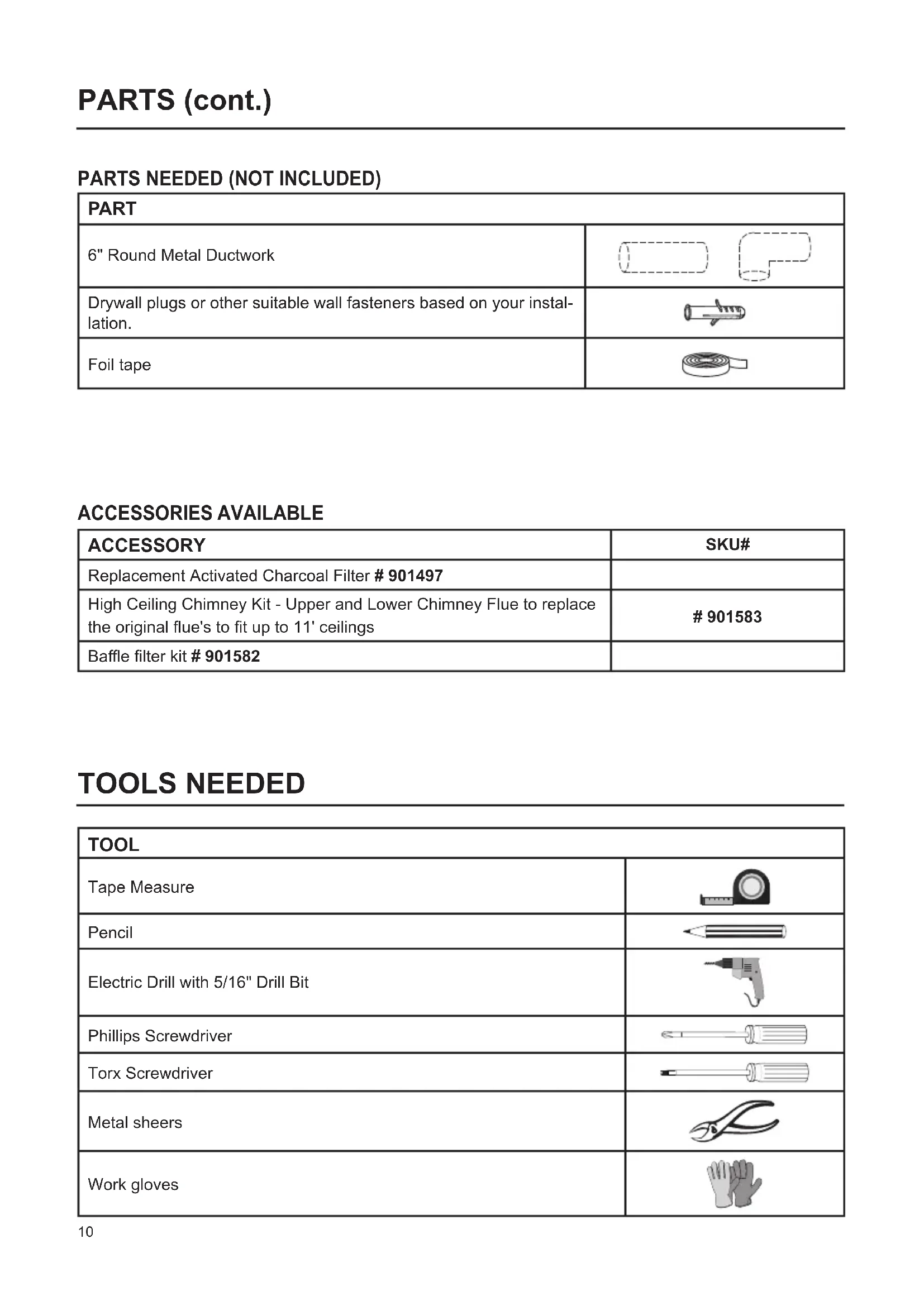 N10 PARTSNEEDED(NOTINCLUDED) PARTS(cont.) PART 6" Round Metal Ductwork Drywall plugs or other suitable wall fasteners based on your instal- lation. Foil tape TOOLS NEEDED TOOL Tape Measure Pencil Electric Drill with 5/16" Drill Bit Phillips Screwdriver Torx Screwdriver Metal sheers Work gloves ACCESSORIES AVAILABLE ACCESSORY SKU# Replacement Activated Charcoal Filter # 901497 High Ceiling Chimney Kit - Upper and Lower Chimney Flue to replace the original ue's to t up to 11' ceilings # 901583 Bae lter kit # 90158211 VENTING METHOD VENTED RECIRCULATING