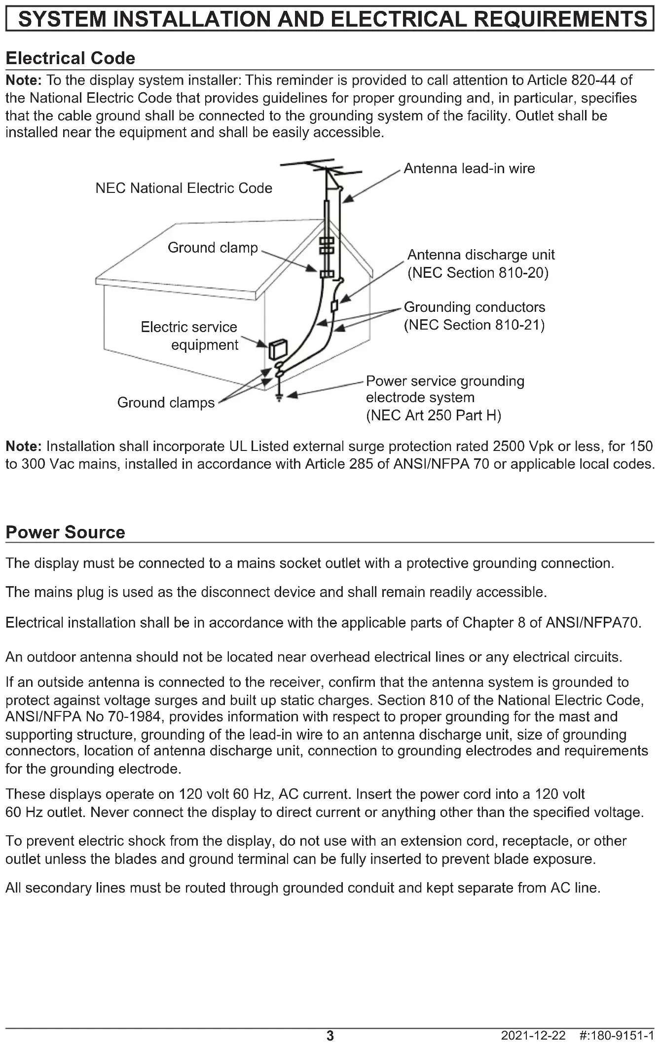 Electrical Code Note: To the display system installer: This reminder is provided to call attention to Article 820-44 of the National Electric Code that provides guidelines for proper grounding and, in particular, species that the cable ground shall be connected to the grounding system of the facility. Outlet shall be installed near the equipment and shall be easily accessible. Antenna discharge unit (NEC Section 810-20) NEC National Electric Code Ground clamp Electric service equipment Ground clamps Power service grounding electrode system (NEC Art 250 Part H) Grounding conductors (NEC Section 810-21) Antenna lead-in wire Power Source The display must be connected to a mains socket outlet with a protective grounding connection. The mains plug is used as the disconnect device and shall remain readily accessible. Electrical installation shall be in accordance with the applicable parts of Chapter 8 of ANSI/NFPA70. An outdoor antenna should not be located near overhead electrical lines or any electrical circuits. If an outside antenna is connected to the receiver, conrm that the antenna system is grounded to protect against voltage surges and built up static charges. Section 810 of the National Electric Code, ANSI/NFPA No 70-1984, provides information with respect to proper grounding for the mast and supporting structure, grounding of the lead-in wire to an antenna discharge unit, size of grounding connectors, location of antenna discharge unit, connection to grounding electrodes and requirements for the grounding electrode. These displays operate on 120 volt 60 Hz, AC current. Insert the power cord into a 120 volt 60 Hz outlet. Never connect the display to direct current or anything other than the specied voltage. To prevent electric shock from the display, do not use with an extension cord, receptacle, or other outlet unless the blades and ground terminal can be fully inserted to prevent blade exposure. All secondary lines must be routed through grounded conduit and kept separate from AC line. Note: Installation shall incorporate UL Listed external surge protection rated 2500 Vpk or less, for 150 to 300 Vac mains, installed in accordance with Article 285 of ANSI/NFPA 70 or applicable local codes.4 2021-12-22 #:180-9151-1 Relevant Information Record your display's model and serial number here for future reference. Keep this user manual in an accessible location in the event service is required. Note: Your display's serial number can be found on the box and underneath the rear cover plate. Model Number ____________________________________ Serial Number ____________________________________ FCC CAUTION To assure continued compliance and possible undesirable interference, ferrite cores may be used when connecting this display to video equipment; maintain at least 400mm (15.75 inches) spacing to other peripheral devices. FCC STATEMENT This equipment has been tested and found to comply with the limits for a Class B digital device, pursuant to Part 15 of the FCC Rule. These limits are designed to provide reasonable protection against harmful interference in a residential installation. This equipment generates, uses and can radiate radio frequency energy and, if not installed and used in accordance with these instructions, may cause harmful interference to radio communications; however, there is no guarantee that interference will not occur in a particular installation. If this equipment does cause harmful interference to radio or television reception, which can be determined by turning the equipment o and on, the user is encouraged to try to correct the interference by one or more of the following measures: