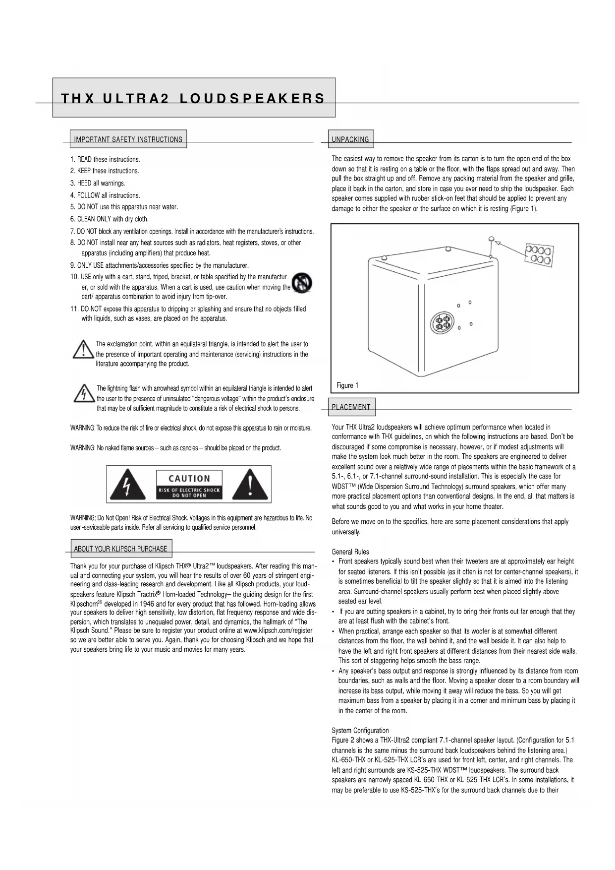 developed in 1946 and for every product that has followed. Horn-loading allows your speakers to deliver high sensitivity, low distortion, flat frequency response and wide dis- persion, which translates to unequaled power, detail, and dynamics, the hallmark of “The Klipsch Sound.” Please be sure to register your product online at www.klipsch.com/register so we are better a ble to serve you. Again, thank you for choosing Klipsch and we hope that your speakers bring life to your music and movies for many years. UNPACKING The easiest way to remove the speaker from its carton is to turn the open end of the box down so that it is resting on a table or the floor, with the flaps spread out and away. Then pull the box straight up and off. Remove any packing material from the speaker and grille, place it back in the carton, and store in case you ever need to ship the loudspeaker. Each speaker comes supplied with rubber stick-on feet that should be applied to prevent any damage to either the speaker or the surface on which it is resting (Figure 1). PLACEMENT Your THX Ultra2 loudspeakers will achieve optimum performance when located in conformance with THX guidelines, on which the following instructions are based. Don’t be discouraged if some compromise is necessary, however, or if modest adjustments will make the system look much better in the room. The speakers are engineered to deliver excellent sound over a relatively wide range of placements within the basic framework of a 5.1-, 6.1-, or 7.1-channel surround-sound installation. This is especially the case for WDST™ (Wide Dispersion Surround Technology) surround speakers, which offer many more practical placement options than conventional designs. In the end, all that matters is what sounds good to you and what works in your home theater. Before we move on to the specifics, here are some placement considerations that apply universall