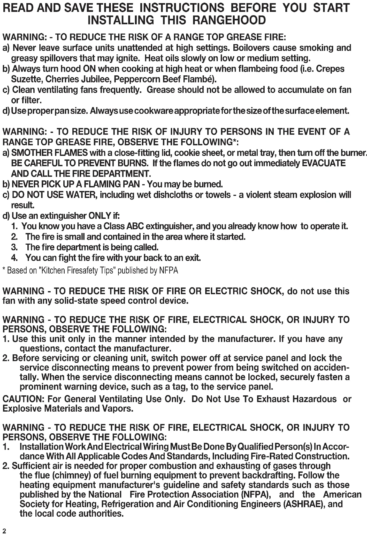 - Based on "Kitchen Firesafety Tips" published by NFPA WARNING - TO REDUCE THE RISK OF FIRE OR ELECTRIC SHOCK, do not use this fan with any solid-state speed control device. WARNING - TO REDUCE THE RISK OF FIRE, ELECTRICAL SHOCK, OR INJURY TO PERSONS, OBSERVE THE FOLLOWING: