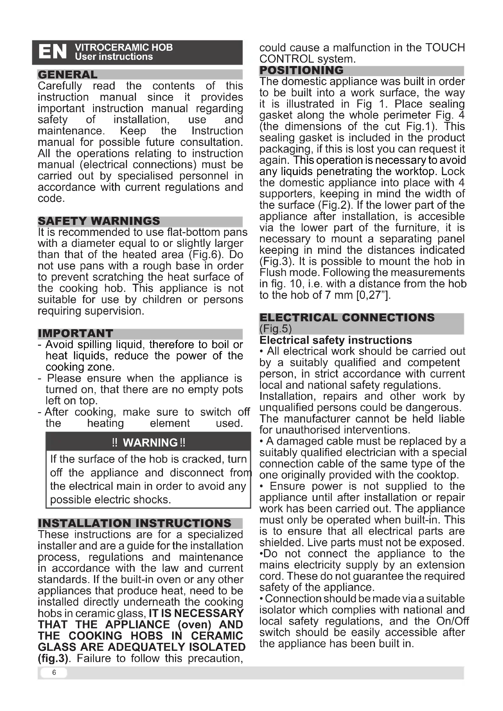 If the surface of the hob is cracked, turn off the appliance and disconnect from the electrical main in order to avoid any possible electric shocks.