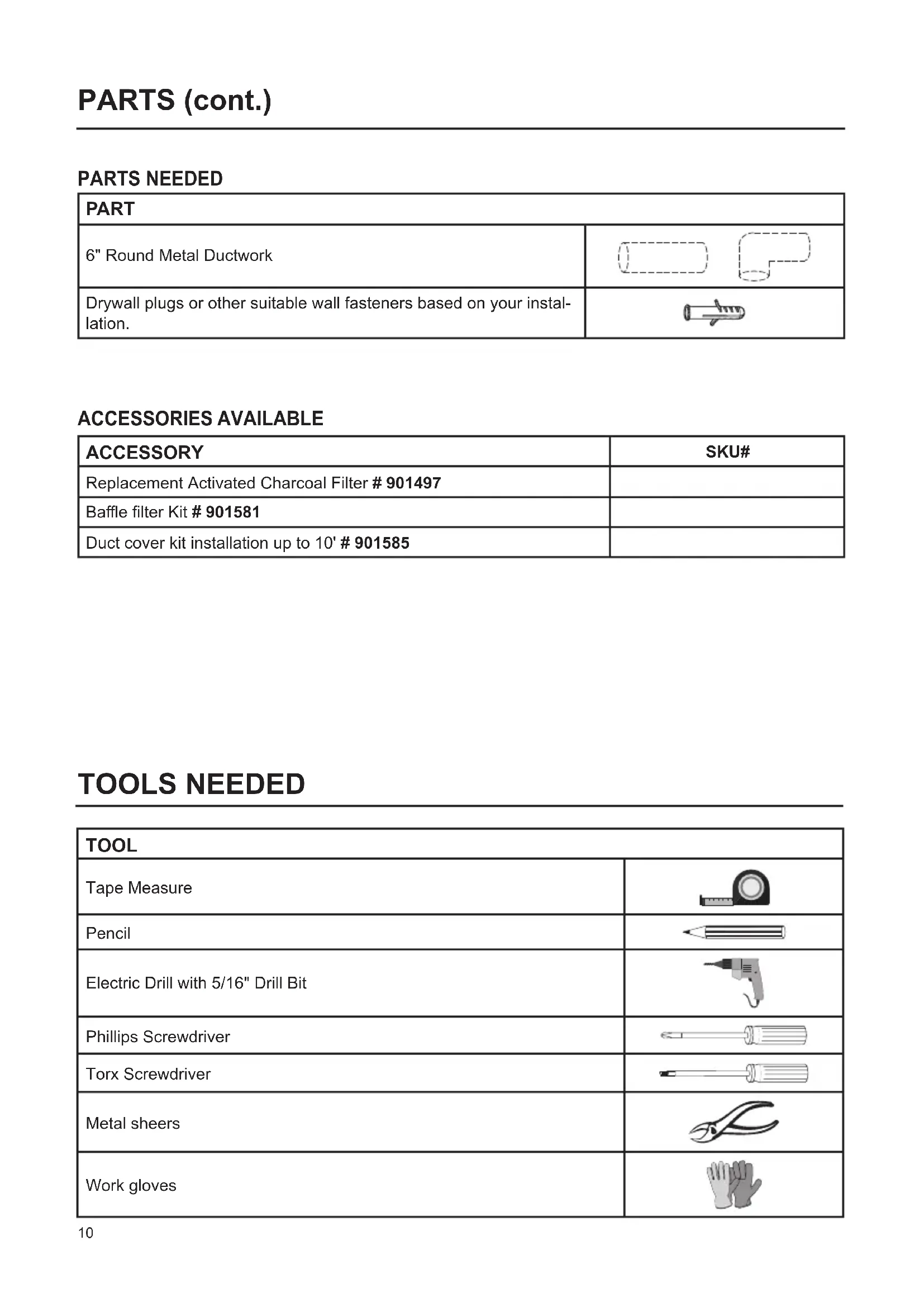 2x(M4x15) 4x(3,5x9,5) 2x(2,9x9,5) 2x(2,9x6,5)10 PARTS NEEDED PARTS(cont.) PART 6" Round Metal Ductwork Drywall plugs or other suitable wall fasteners based on your instal- lation. TOOLS NEEDED TOOL Tape Measure Pencil Electric Drill with 5/16" Drill Bit Phillips Screwdriver Torx Screwdriver Metal sheers Work gloves ACCESSORIES AVAILABLE ACCESSORY SKU# Replacement Activated Charcoal Filter # 901497 Bae lter Kit # 901581 Duct cover kit installation up to 10' # 90158511 VENTING METHOD Ducted Venting Installation Non ducted - recirculation