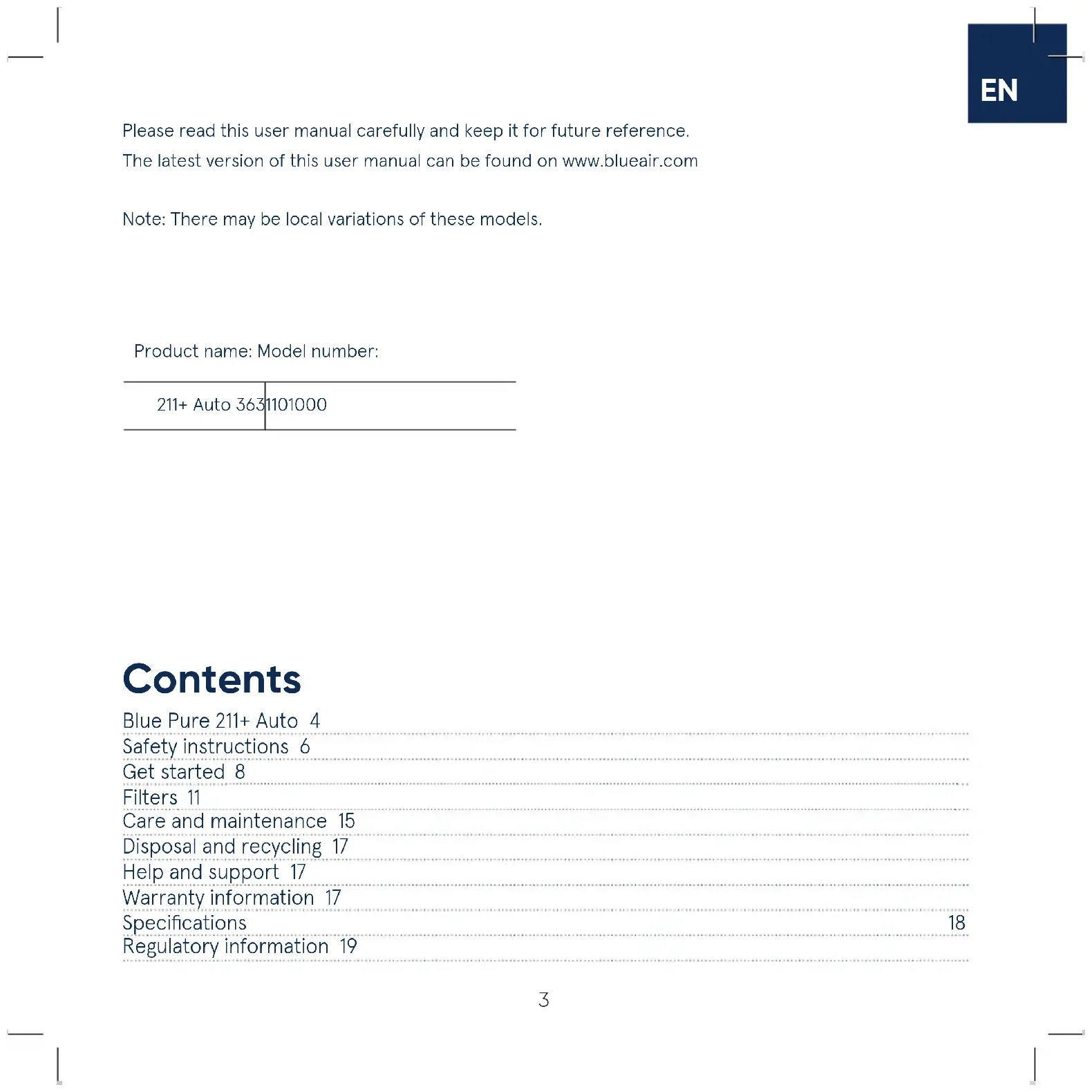 Blue Pure 211+ Auto 4 Safety instructions 6 Get started 8 Filters 11 Care and maintenance 15 Disposal and recycling 17 Help and support 17 Warranty information 17 Specifications 18 Regulatory information 19 Contents Please read this user manual carefully and keep it for future reference. The latest version of this user manual can be found on www.blueair.com Note: There may be local variations of these models. Product name: Model number: 211+ Auto 36311010004 Blue Pure 211+ Auto The air purifier has a pre-filter and a HEPASilent