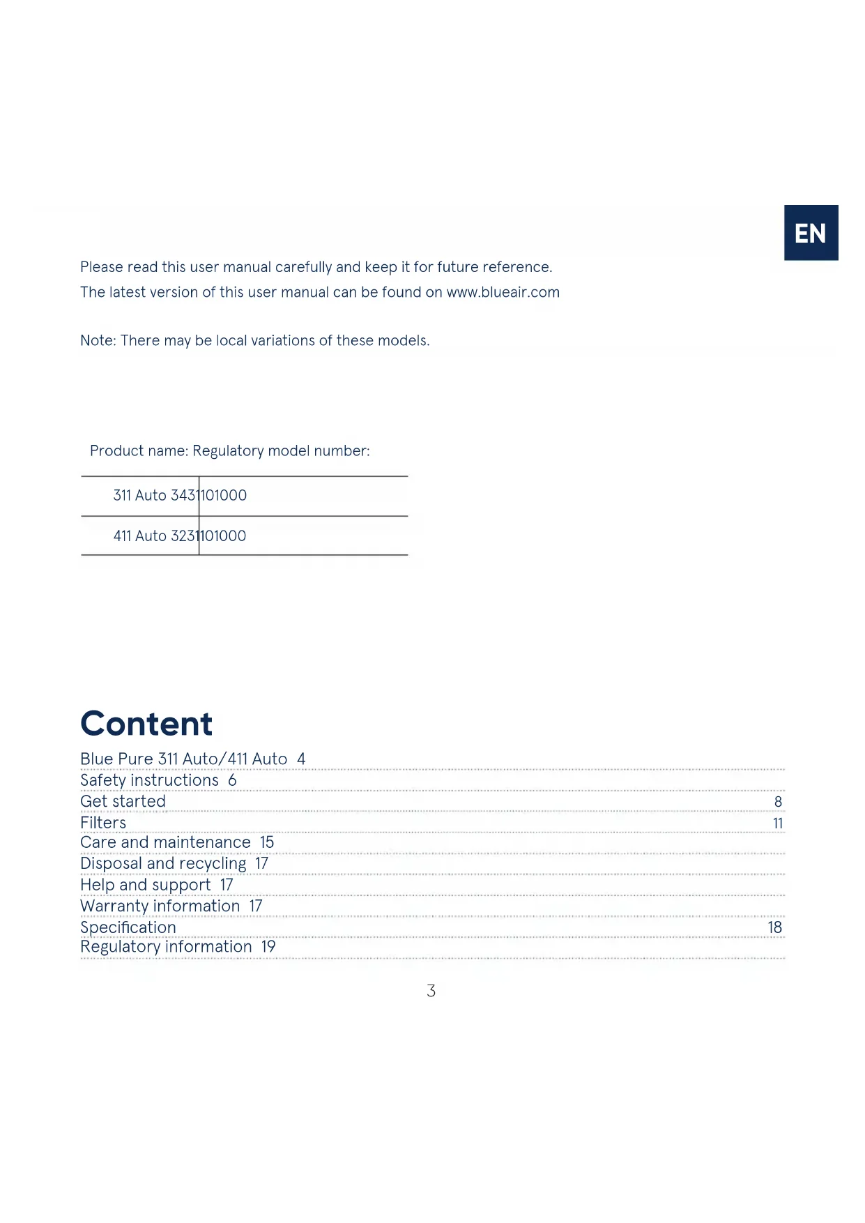 Blue Pure 311 Auto/411 Auto 4 Safety instructions 6 Get started 8 Filters 11 Care and maintenance 15 Disposal and recycling 17 Help and support 17 Warranty information 17 Specification 18 Regulatory information 19 Content Please read this user manual carefully and keep it for future reference. The latest version of this user manual can be found on www.blueair.com Note: There may be local variations of these models. Product name: Regulatory model number: 311 Auto 3431101000 411 Auto 32311010004 Blue Pure 311 Auto/411 Auto Blue Pure air purifiers are available in two models. All models have a pre-filter and a HEPASilent