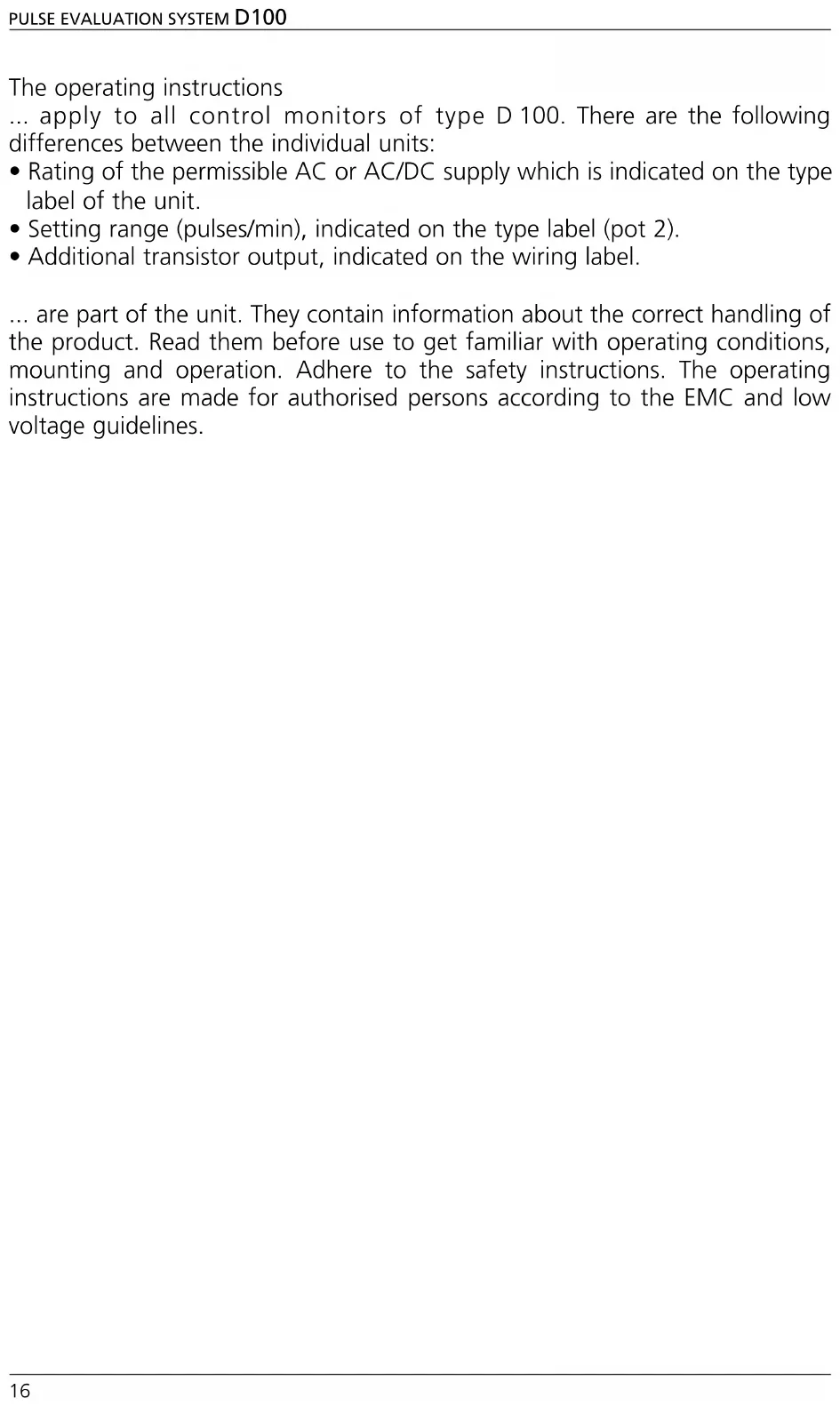 ... are part of the unit. They contain information about the correct handling of the product. Read them before use to get familiar with operating conditions, mounting and operation. Adhere to the safety instructions. The operating instructions are made for authorised persons according to the EMC and low voltage guidelines.