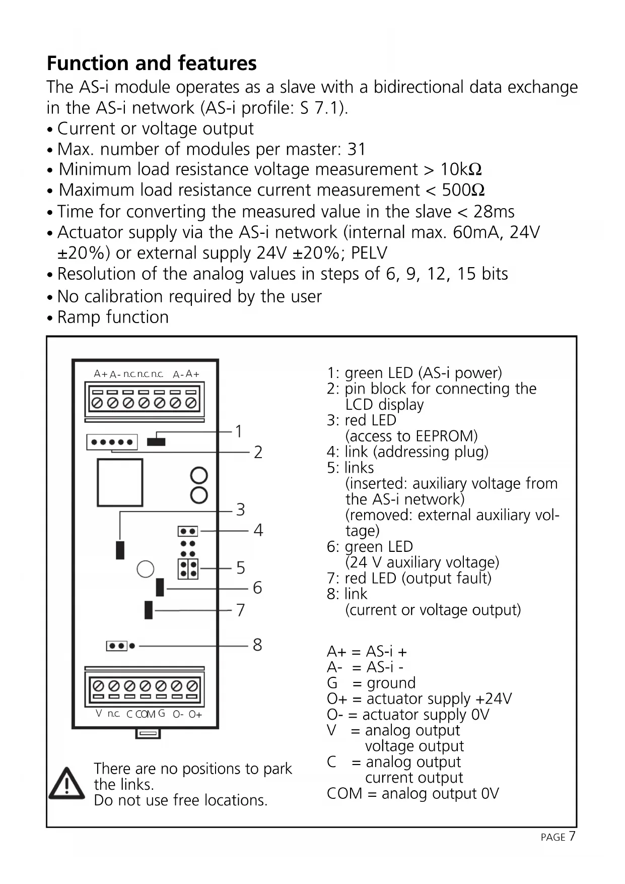 n.c. A + A - A - A + n.c. n.c. n.c. 1: green LED (AS-i power) 2: pin block for connecting the LCD display 3: red LED (access to EEPROM) 4: link (addressing plug) 5: links (inserted: auxiliary voltage from the AS-i network) (removed: external auxiliary vol- tage) 6: green LED (24 V auxiliary voltage) 7: red LED (output fault) 8: link (current or voltage output) A+ = AS-i + A- = AS-i - G = ground O+ = actuator supply +24V O- = actuator supply 0V V = analog output voltage output C = analog output current output COM = analog output 0V There are no positions to park the links. Do not use free locations.Mounting Mount the module onto a 35mm rail or fasten it onto a mounting device (accessories required E70119). Electrical connection The actuator must always be ungrounded! If an external potential is used, it must be a PELV voltage. The electrical separation to the AS-i system is rated for 500V. Links may only be inserted or removed with the system being dis- connected. Voltage output Parameter setting: P0 = 1: voltage output P1 = 1: measuring range 0 ... 10V, resolution 0.3mV or P1 = 0: measuring range 0 ... 10V, resolution 1mV Supply via AS-i External supply PAGE 8