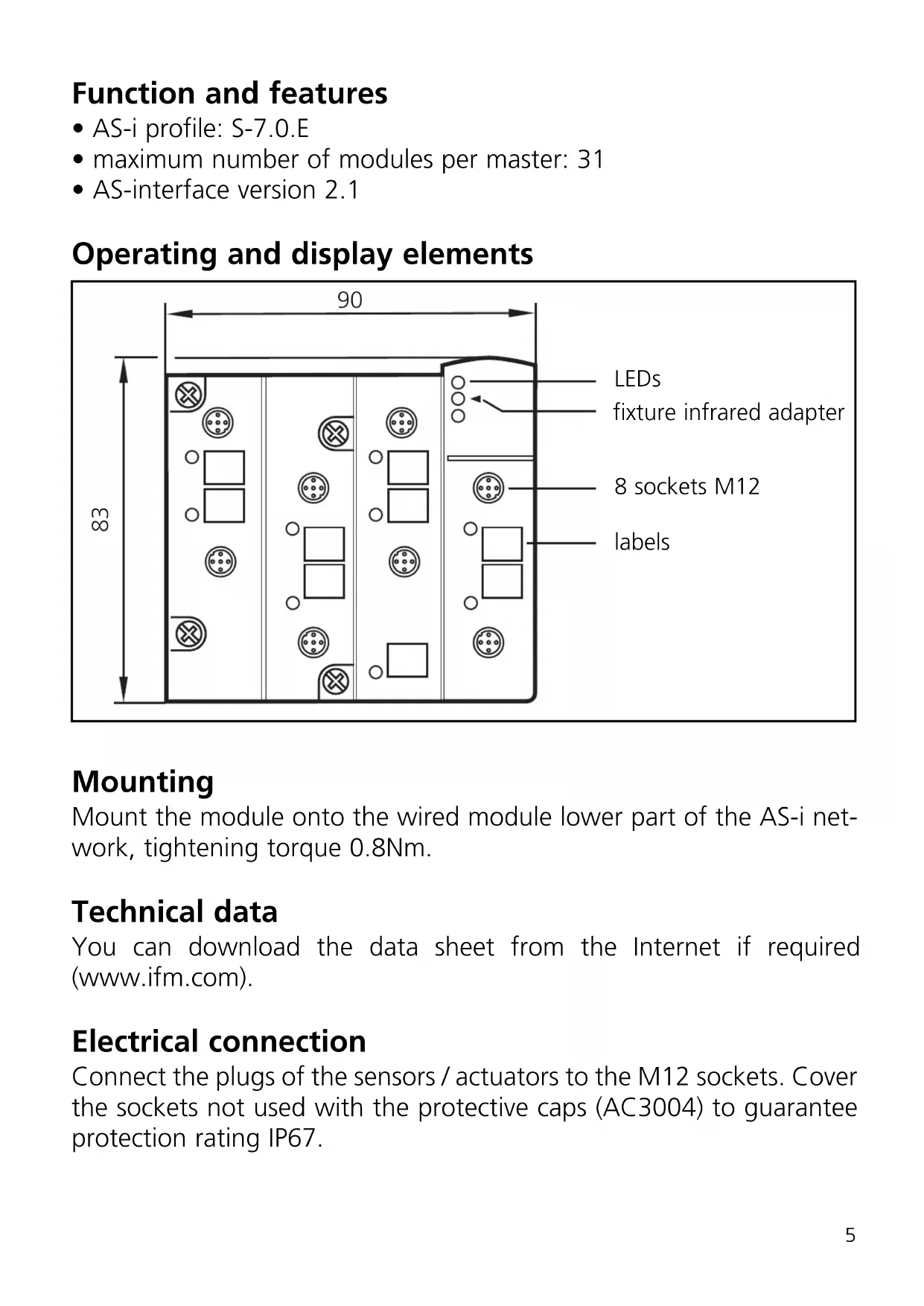 - AS-interface version 2.1 Operating and display elements Mounting Mount the module onto the wired module lower part of the AS-i net- work, tightening torque 0.8Nm. Technical data You can download the data sheet from the Internet if required (www.ifm.com). Electrical connection Connect the plugs of the sensors / actuators to the M12 sockets. Cover the sockets not used with the protective caps (AC3004) to guarantee protection rating IP67.