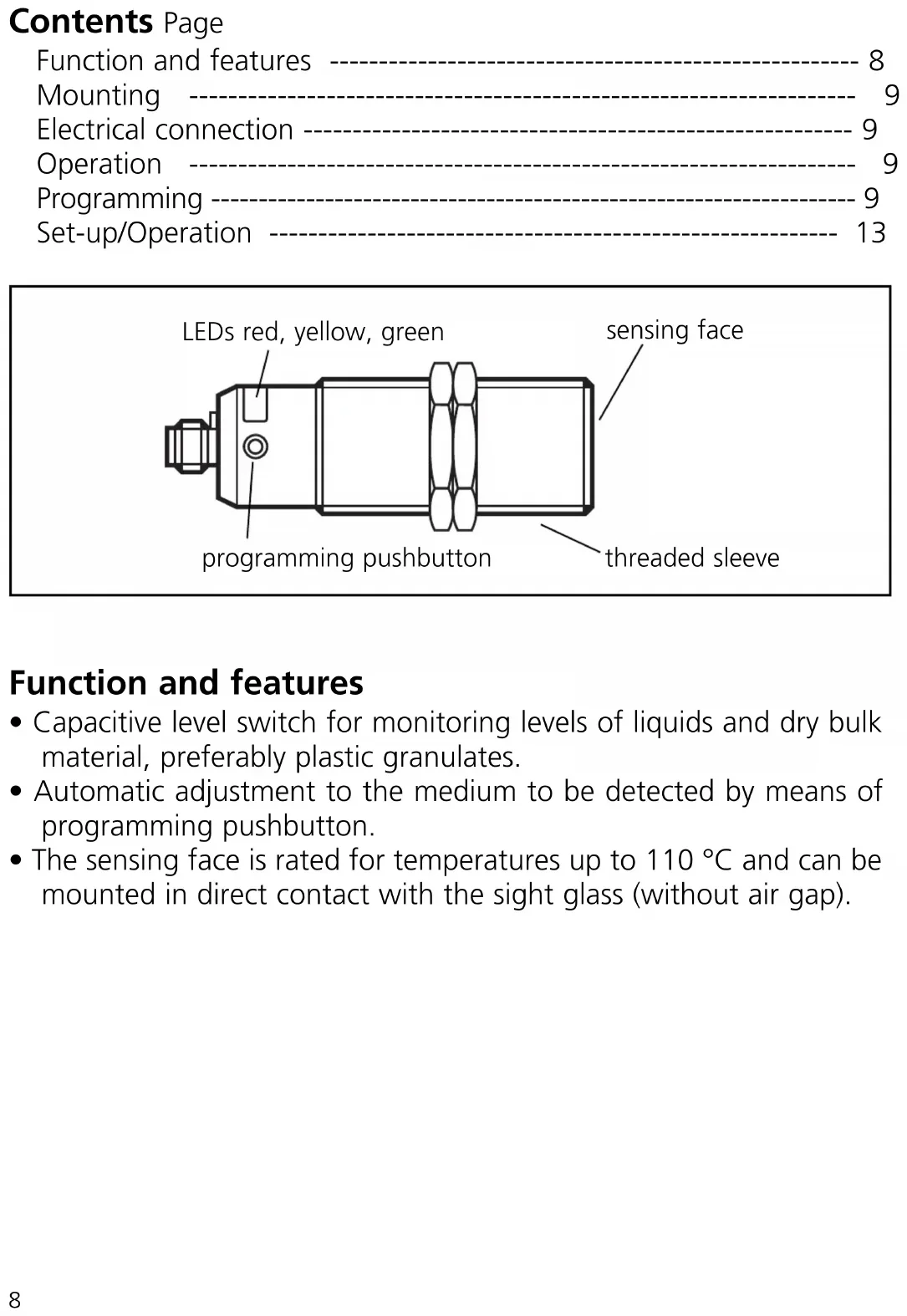 programming pushbutton LEDs red, yellow, green sensing face threaded sleeveMounting Mount the level switch as shown: Electrical connection Disconnect the installation from power. Connect the unit (see type label). Operation Adjust the sensor. To do so, press the programming pushbutton with a blunt object. Programming Overview of the modes and their basic functions: