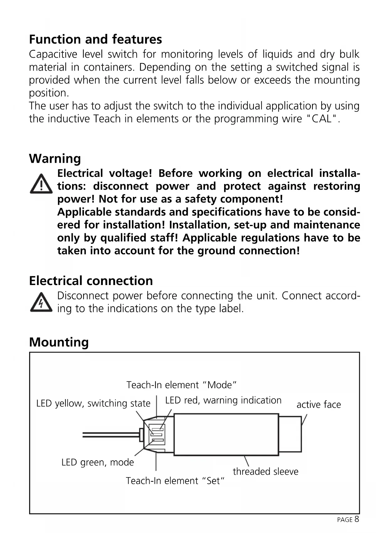 - Die SET-Funktion ist zusätzlich über die Programmierleitung "CAL" möglich (Gilt nicht für Artikel KNM.../OF). Zum Aktivieren der Funktion wird die Leitung "CAL" elektrisch mit Leitung "N" verbunden. Betrieb Prüfen Sie, ob das Gerät sicher funktioniert. Anzeige durch LED. SEITE 7Function and features Capacitive level switch for monitoring levels of liquids and dry bulk material in containers. Depending on the setting a switched signal is provided when the current level falls below or exceeds the mounting position. The user has to adjust the switch to the individual application by using the inductive Teach in elements or the programming wire "CAL". Warning Electrical voltage! Before working on electrical installa- tions: disconnect power and protect against restoring power! Not for use as a safety component! Applicable standards and specifications have to be consid- ered for installation! Installation, set-up and maintenance only by qualified staff! Applicable regulations have to be taken into account for the ground connection! Electrical connection Disconnect power before connecting the unit. Connect accord- ing to the indications on the type label. Mounting PAGE 8 Teach-In element “Mode” Teach-In element “Set“ LED yellow, switching state LED red, warning indication active face threaded sleeve LED green, modeThe sensor characteristics of a capacitive unit (medium sensitivity, humidity compensation etc.) depend strongly on the mounting posi- tion. Consequently, you can fully benefit from the technical advan- tages of the unit's electronically controlled adjustment when mounting has been completed. Setting The sensor is set via 2 inductive Teach-In elements (functions *SET and MODE). If you touch the marked field with a metal object (e.g. screwdriver), the respective Teach-In element is acti- vated. If you remove the object again from the field, the respective Teach-in element is deactivated again. In the text below "actuation" means activating and then deactivating a Teach-In element with a metal object by touching and removing without special time requirements.