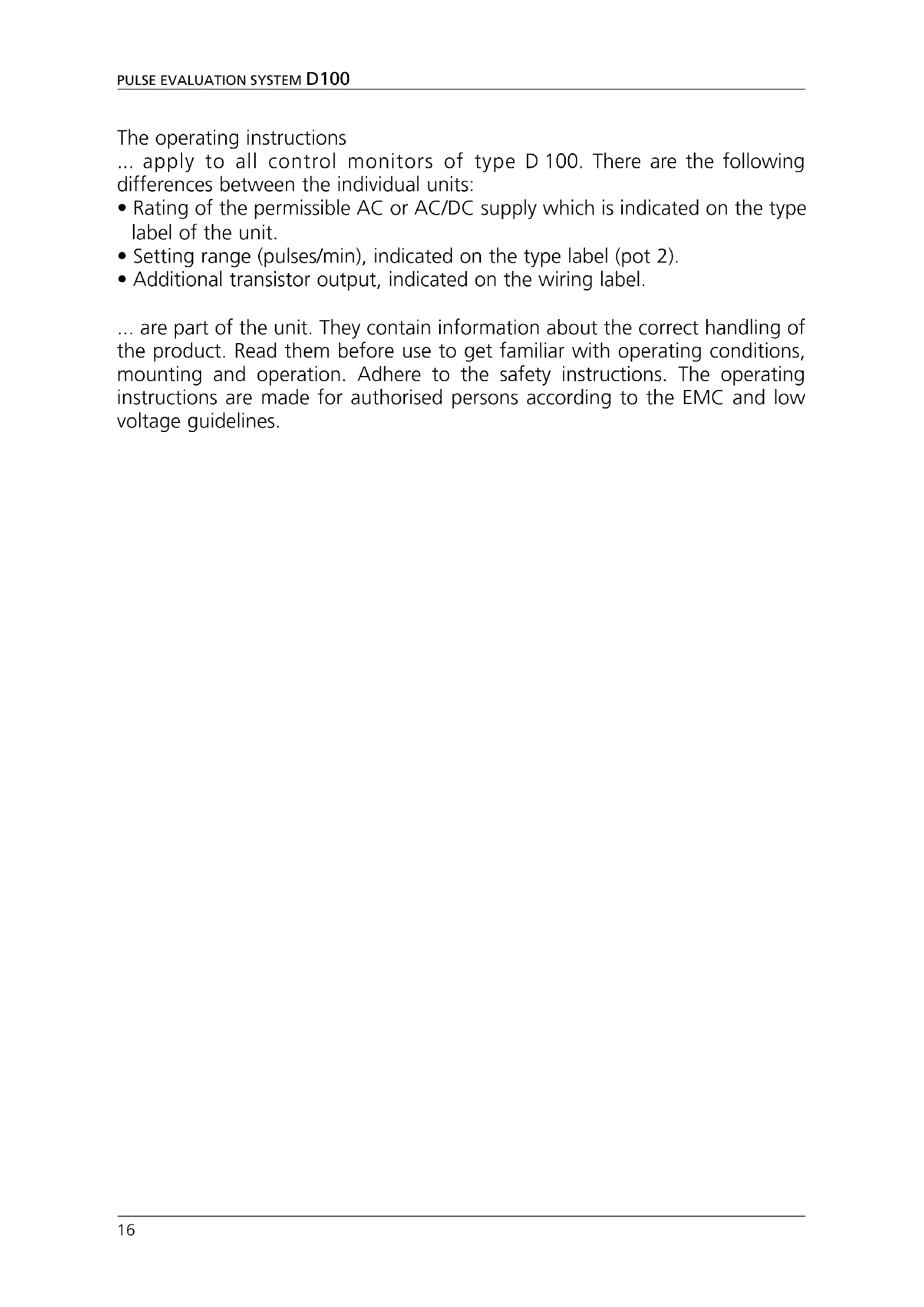 ; AWG 1415 ENGLISH IMPULSAUSWERTESYSTEM D100The operating instructions ... apply to all control monitors of type D 100. There are the following differences between the individual units: