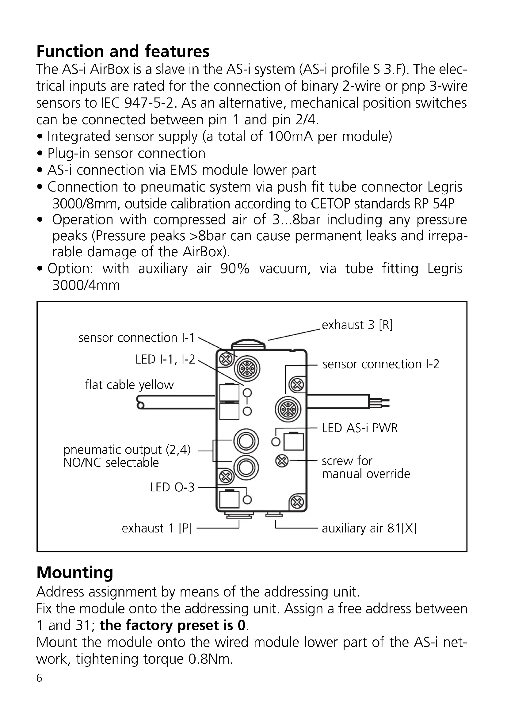 - Option: with auxiliary air 90% vacuum, via tube fitting Legris 3000/4mm Mounting Address assignment by means of the addressing unit. Fix the module onto the addressing unit. Assign a free address between 1 and 31; the factory preset is 0. Mount the module onto the wired module lower part of the AS-i net- work, tightening torque 0.8Nm.