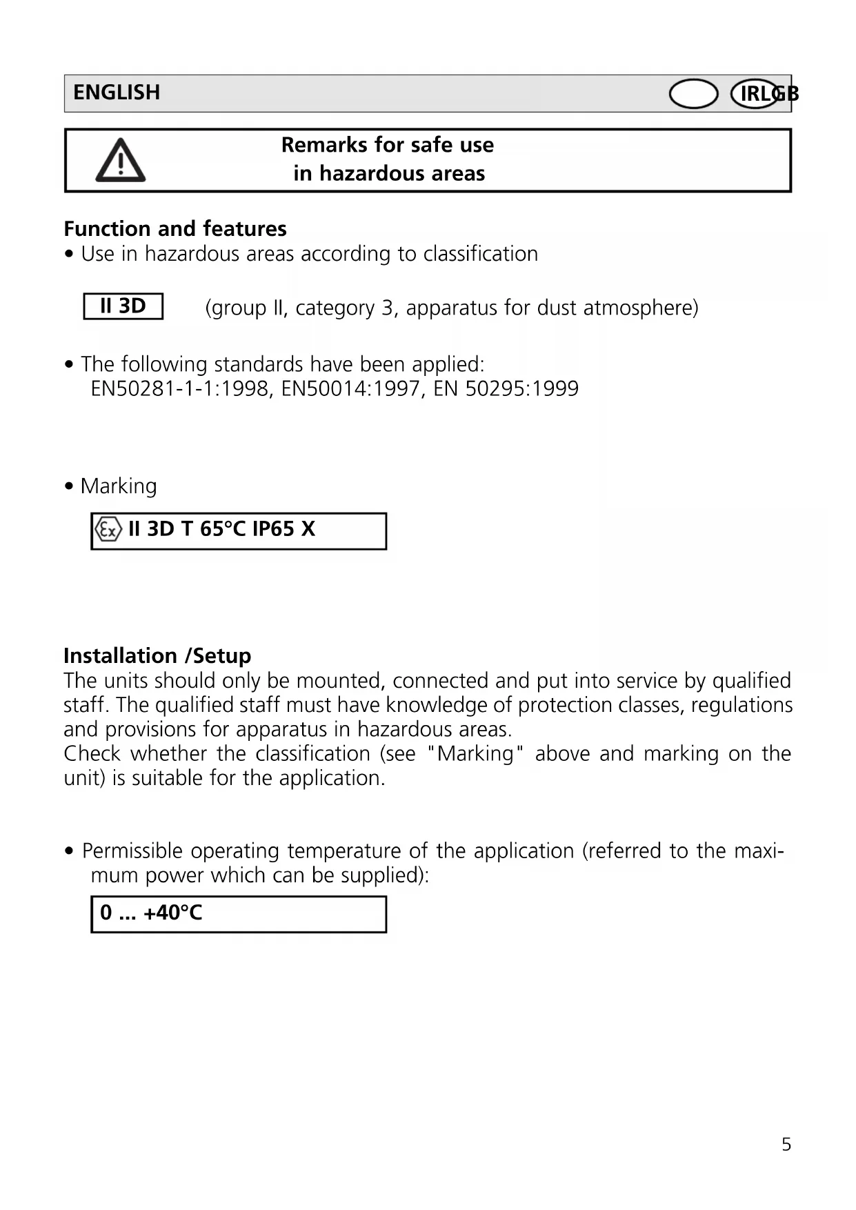 IRLGB ENGLISH• For use in hazardous areas according to the indication compliance with the protection rating is essential. Therefore appropriate care must be taken when mounting the housing and the seals, see installation instructions / mounting. Maintenance /Repair The unit must not be modified nor can it be repaired. In case of a fault please contact the manufacturer.