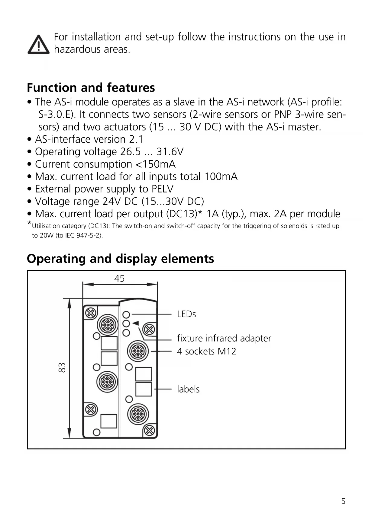 - The AS-i module operates as a slave in the AS-i network (AS-i profile: S-3.0.E). It connects two sensors (2-wire sensors or PNP 3-wire sen- sors) and two actuators (15 ... 30 V DC) with the AS-i master.