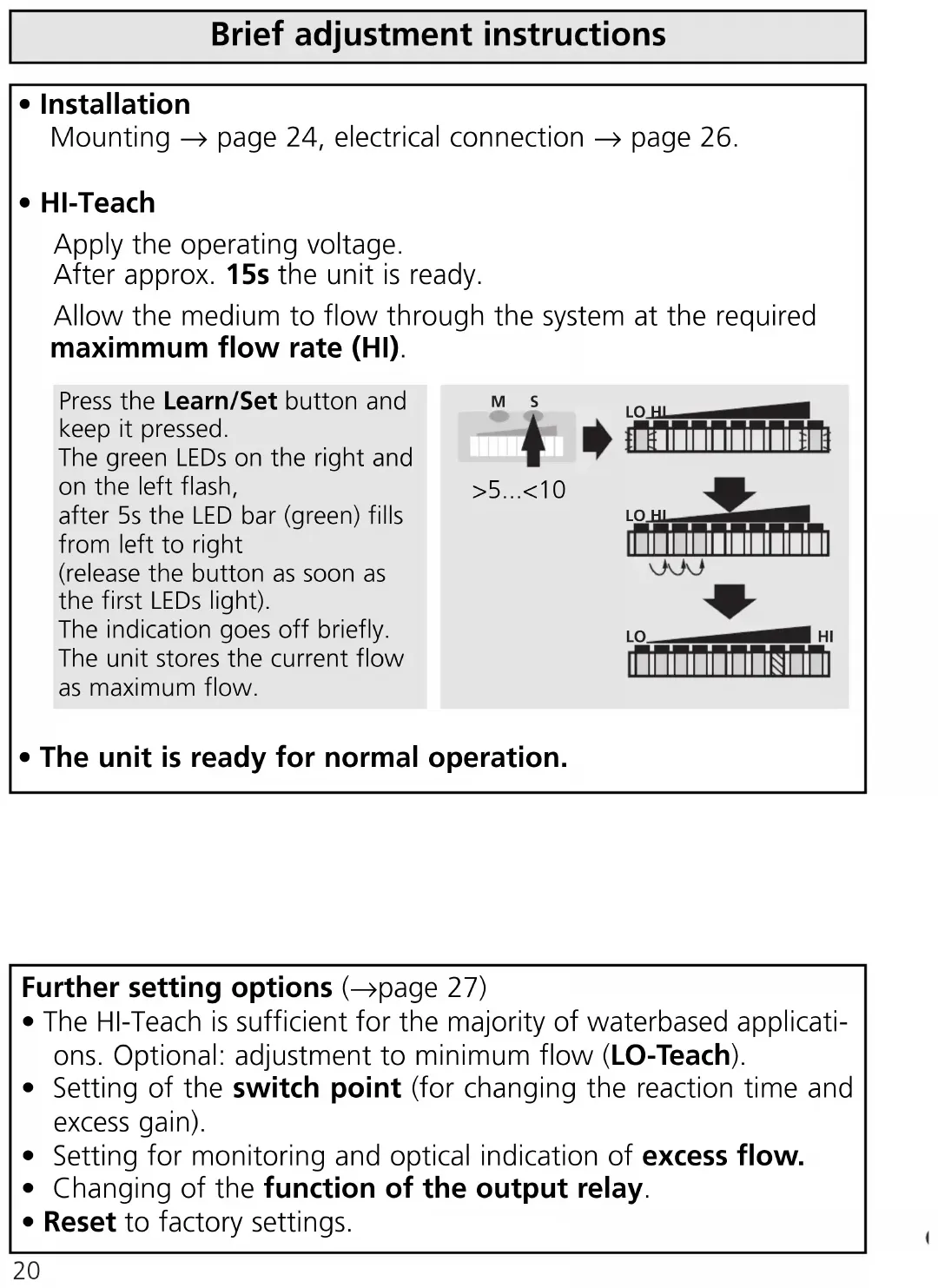 - Press the Learn/Set button for >5...<10s (= adjustment to maxi- mum flow / upper limit of the detection range). Optional: LO-Teach The HI-Teach is sufficient for the majority of waterbased applica- tions. Optional: adjustment to minimum flow.