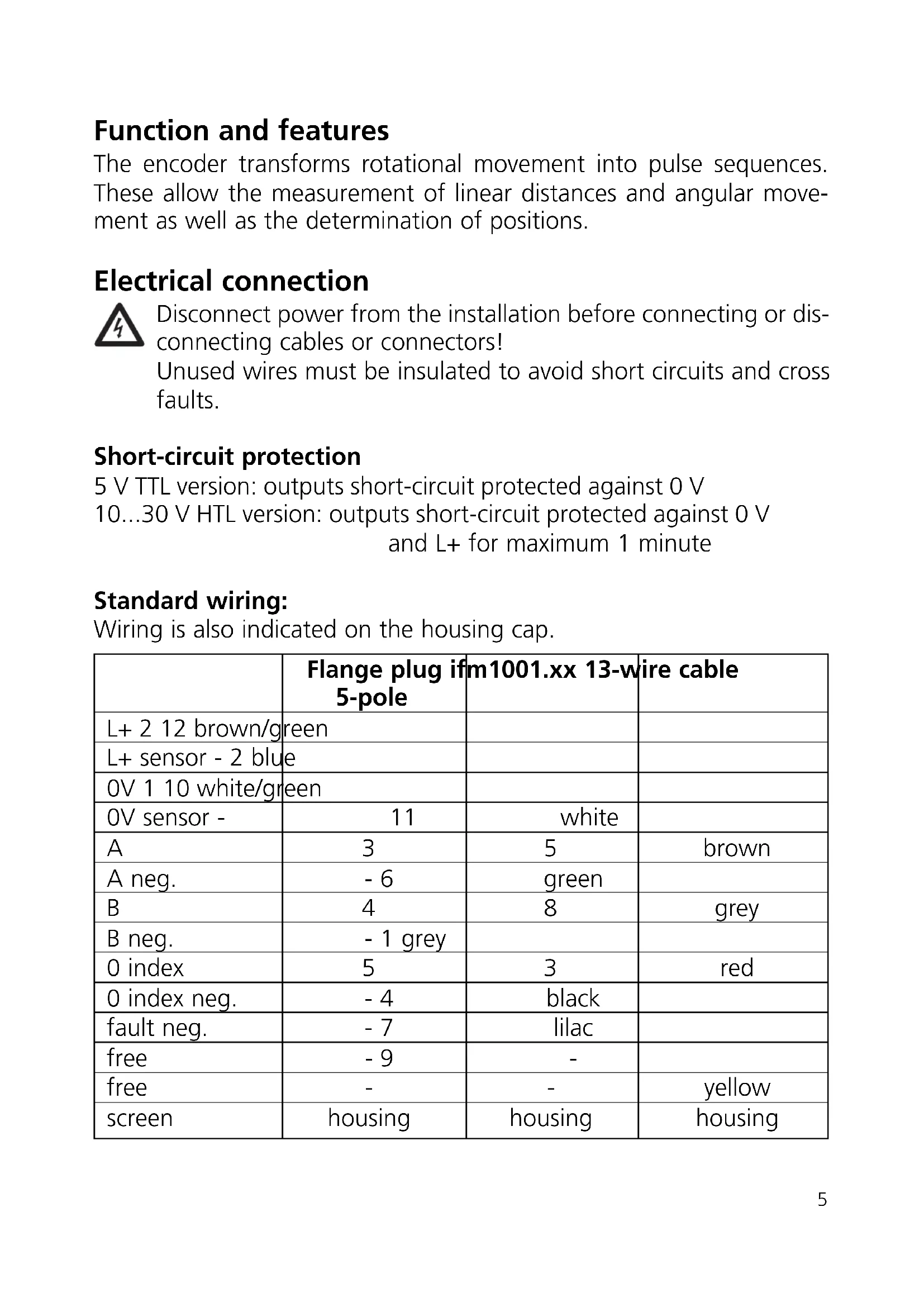 The encoder transforms rotational movement into pulse sequences. These allow the measurement of linear distances and angular move- ment as well as the determination of positions. Electrical connection Disconnect power from the installation before connecting or dis- connecting cables or connectors! Unused wires must be insulated to avoid short circuits and cross faults. Short-circuit protection 5 V TTL version: outputs short-circuit protected against 0 V 10...30 V HTL version: outputs short-circuit protected against 0 V and L+ for maximum 1 minute Standard wiring: Wiring is also indicated on the housing cap.