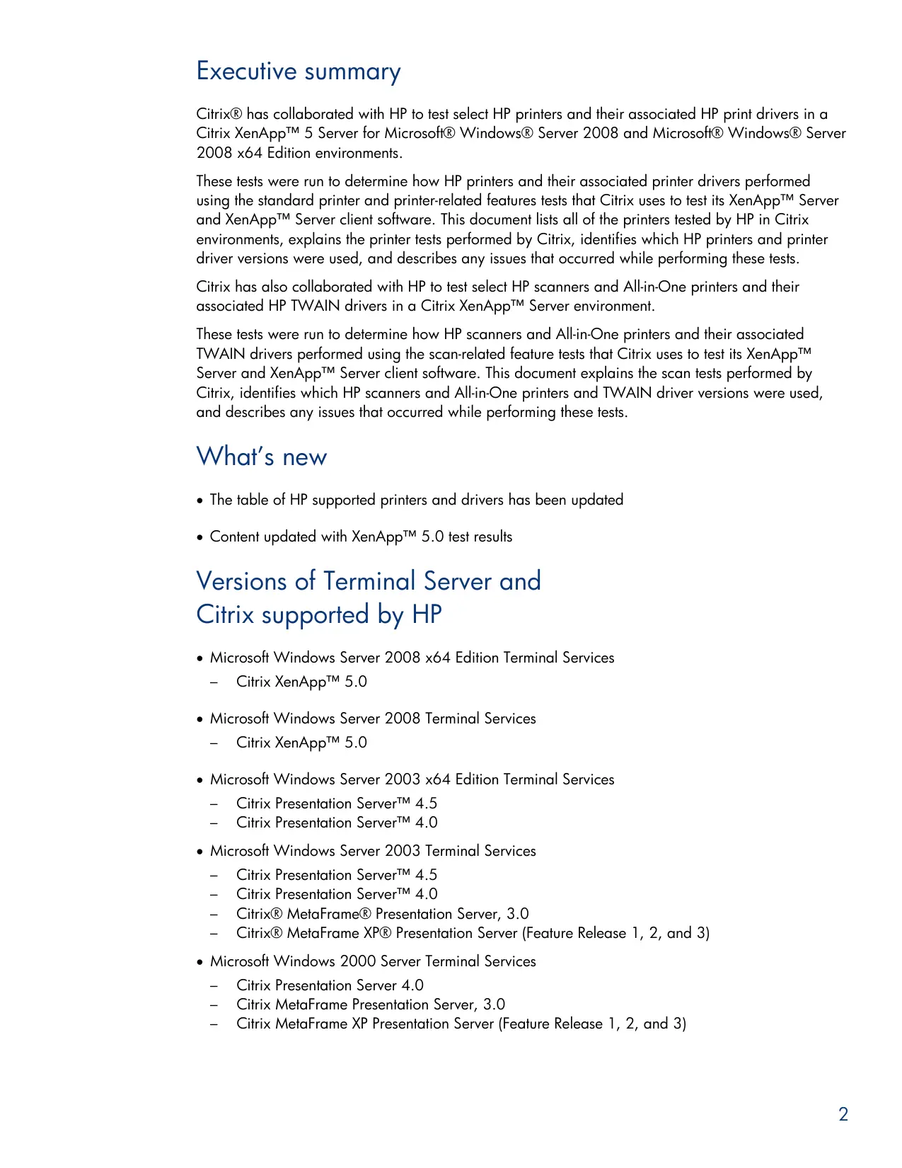 - HP printers supported in Citrix XenApp Server environments November 2008 Executive summary p. 2