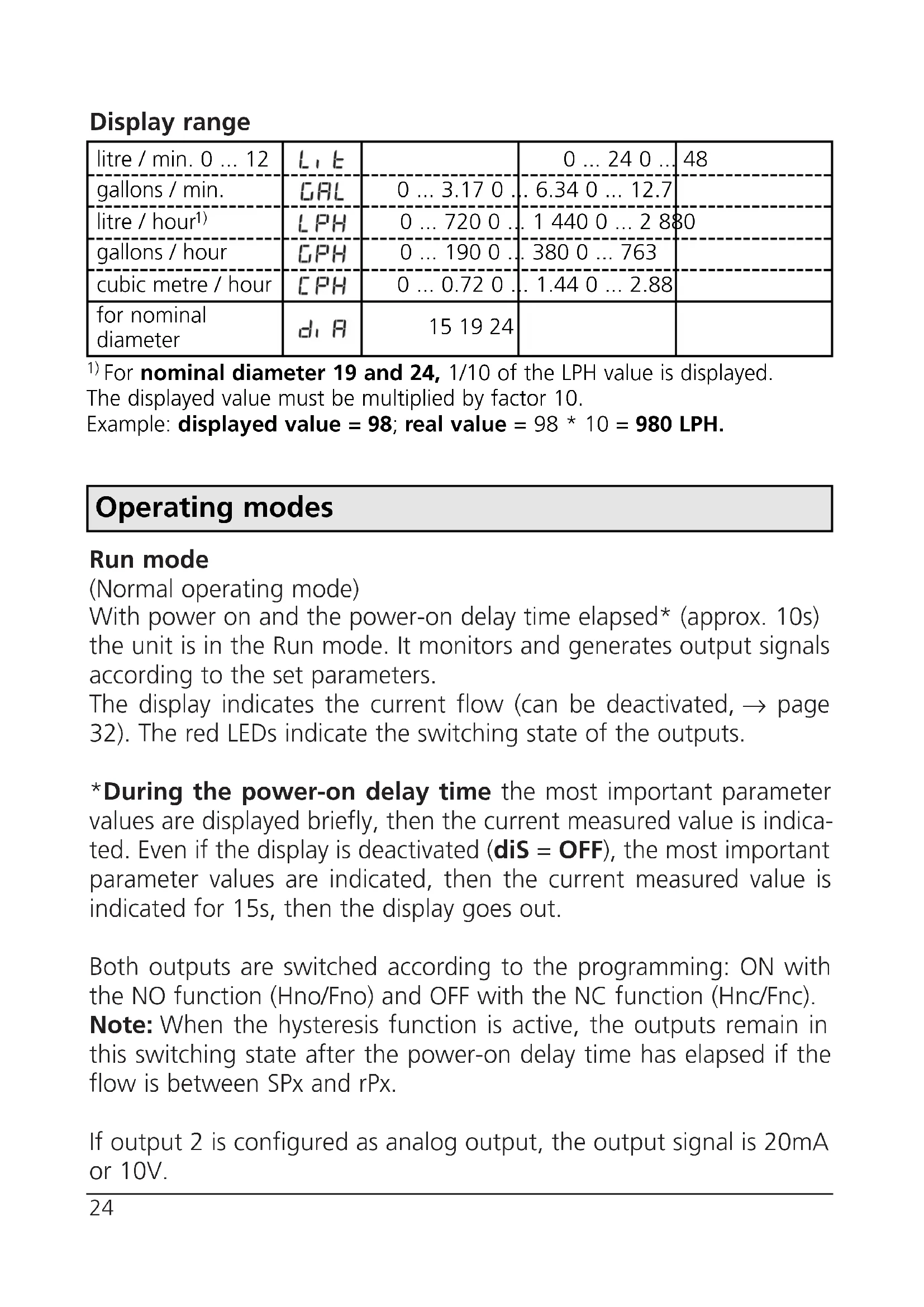 gallons / hour cubic metre / hour for nominal diameterDisplay range Run mode (Normal operating mode) With power on and the power-on delay time elapsed* (approx. 10s) the unit is in the Run mode. It monitors and generates output signals according to the set parameters. The display indicates the current flow (can be deactivated, → page 32). The red LEDs indicate the switching state of the outputs. *During the power-on delay time the most important parameter values are displayed briefly, then the current measured value is indica- ted. Even if the display is deactivated (diS = OFF), the most important parameter values are indicated, then the current measured value is indicated for 15s, then the display goes out. Both outputs are switched according to the programming: ON with the NO function (Hno/Fno) and OFF with the NC function (Hnc/Fnc). Note: When the hysteresis function is active, the outputs remain in this switching state after the power-on delay time has elapsed if the flow is between SPx and rPx. If output 2 is configured as analog output, the output signal is 20mA or 10V.