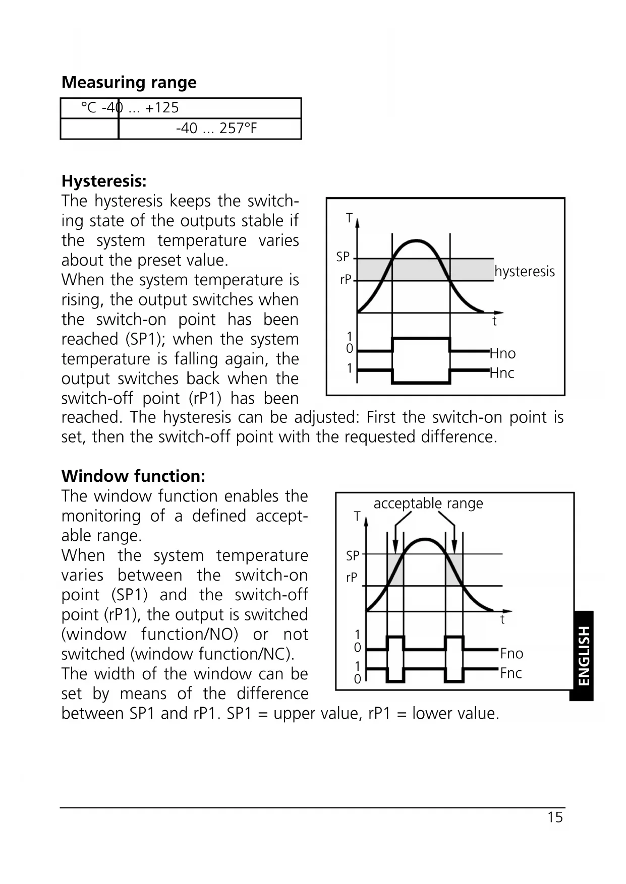 output 1 hysteresis function / N.O. (Hno) hysteresis function / N.C. (Hnc) window function / N.O. (Fno) window function / N.C. (Fnc) output 2 analog 4 ... 20 mA (I) analog 0 ... 10 V (U)Measuring range Hysteresis: The hysteresis keeps the switch- ing state of the outputs stable if the system temperature varies about the preset value. When the system temperature is rising, the output switches when the switch-on point has been reached (SP1); when the system temperature is falling again, the output switches back when the switch-off point (rP1) has been reached. The hysteresis can be adjusted: First the switch-on point is set, then the switch-off point with the requested difference. Window function: The window function enables the monitoring of a defined accept- able range. When the system temperature varies between the switch-on point (SP1) and the switch-off point (rP1), the output is switched (window function/NO) or not switched (window function/NC). The width of the window can be set by means of the difference between SP1 and rP1. SP1 = upper value, rP1 = lower value.