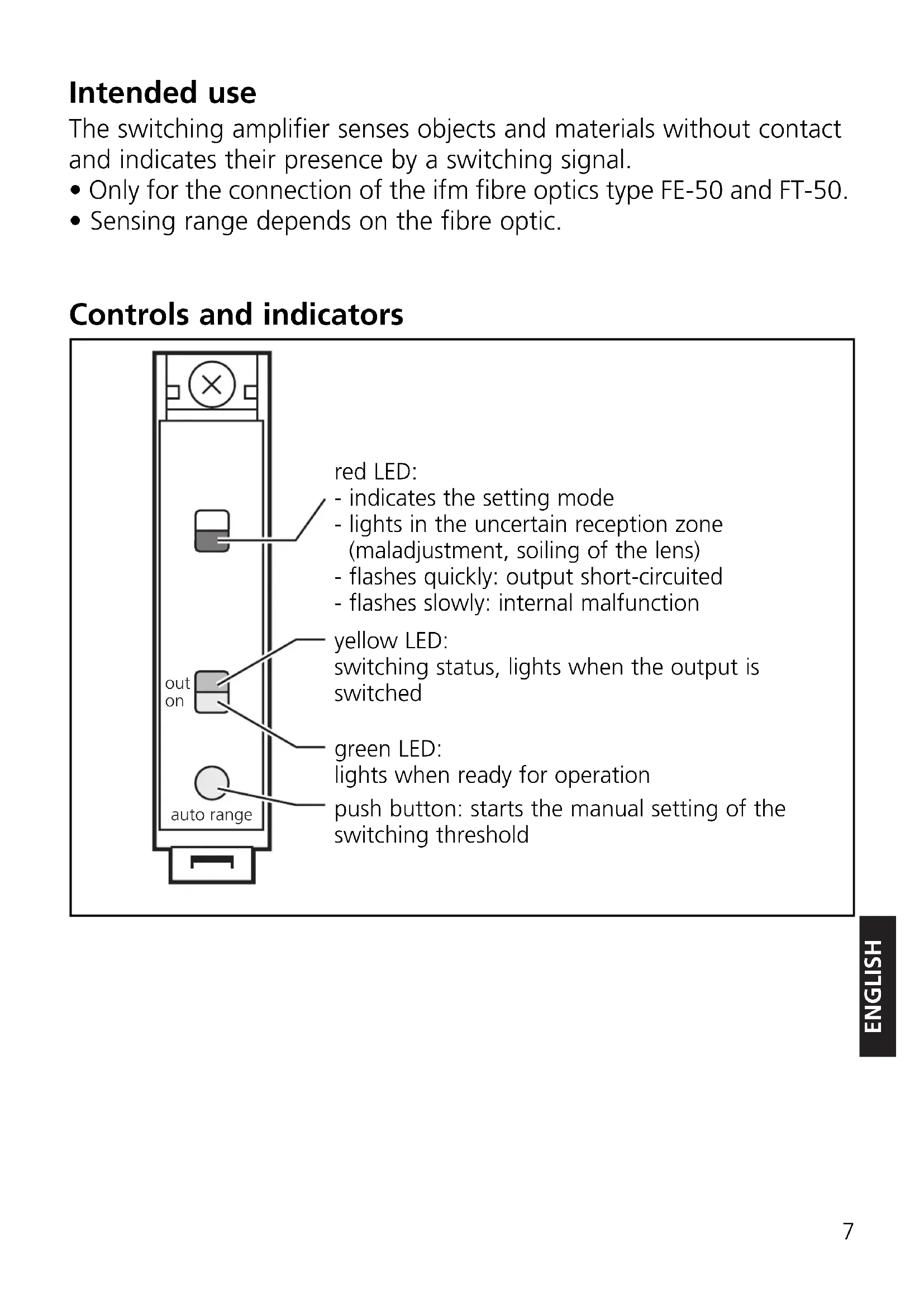 auto range red LED: - indicates the setting mode - lights in the uncertain reception zone (maladjustment, soiling of the lens) - flashes quickly: output short-circuited - flashes slowly: internal malfunction yellow LED: switching status, lights when the output is switched green LED: lights when ready for operation push button: starts the manual setting of the switching threshold8 Mounting Mount the unit on a DIN rail or by means of a mounting fixture. Mount the fibre optics: