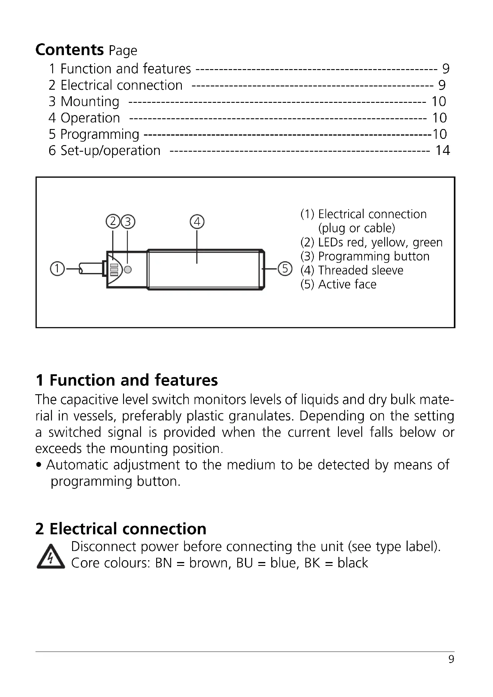 - Automatic adjustment to the medium to be detected by means of programming button. 2 Electrical connection Disconnect power before connecting the unit (see type label). Core colours: BN = brown, BU = blue, BK = black