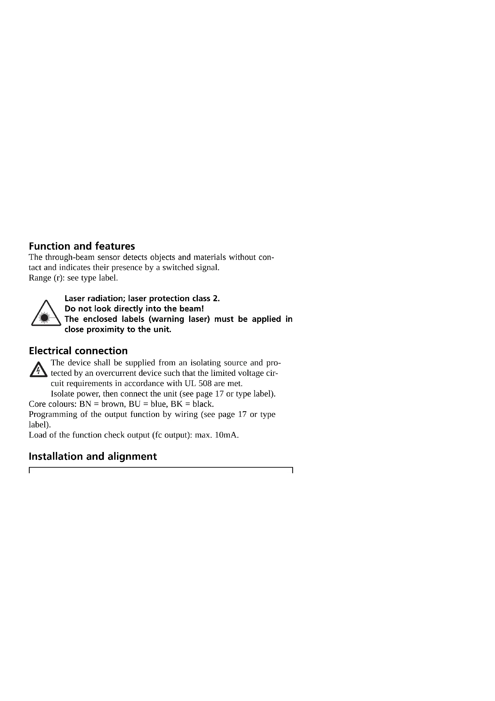 LEDs red, yellow, green setting button LEDs red, yellow, green setting button receiver transmitter LED lensMount the unit so that the mounting position cannot change (in particular avoid high vibrations!). Laser units with a very small light spot diameter are highly focussed; the slightest change in the mounting position will result in misalignment. Adjustment aid For the alignment the transmitter incorporates an adjustment aid. After pressing the setting button on the transmitter the red LED flash- es, then the green LED and the yellow LED flash alternately. The inten- sity of the transmitted light is increased and the light spot is clearly vis- ible. After pressing the button again the green LED is on again and the transmitted light is set again to normal intensity. If the button is not pressed again, the transmitted light is set to nor- mal intensity after about 15 min. NB: Commissioning The through-beam sensor is supplied ready to operate (plug and play) set at the max. sensing range. This is sufficient if the through-beam sensor can operate with maximum excess gain (highest contrast). The following setting procedures should only be necessary in less straight- forward applications, for example if partly transparent objects must be detected. Setting of the sensitivity with stationary objects Press for about 2s until the red LED flashes. Activate the programming mode of the unit. The red LED goes out; the yellow and green LEDs flash alternately. The unit is in the programming mode.