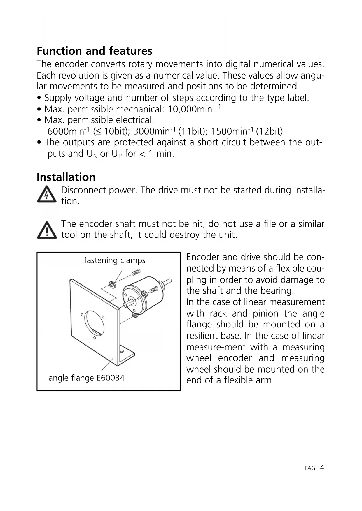 for < 1 min. Installation Disconnect power. The drive must not be started during installa- tion. The encoder shaft must not be hit; do not use a file or a similar tool on the shaft, it could destroy the unit. Encoder and drive should be con- nected by means of a flexible cou- pling in order to avoid damage to the shaft and the bearing. In the case of linear measurement with rack and pinion the angle flange should be mounted on a resilient base. In the case of linear measure-ment with a measuring wheel encoder and measuring wheel should be mounted on the end of a flexible arm. PAGE