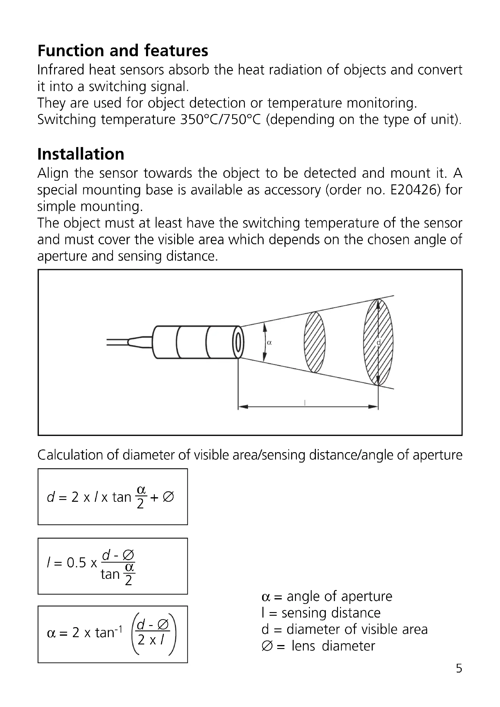 Function and features Infrared heat sensors absorb the heat radiation of objects and convert it into a switching signal. They are used for object detection or temperature monitoring. Switching temperature 350°C/750°C (depending on the type of unit). Installation Align the sensor towards the object to be detected and mount it. A special mounting base is available as accessory (order no. E20426) for simple mounting. The object must at least have the switching temperature of the sensor and must cover the visible area which depends on the chosen angle of aperture and sensing distance. Calculation of diameter of visible area/sensing distance/angle of aperture