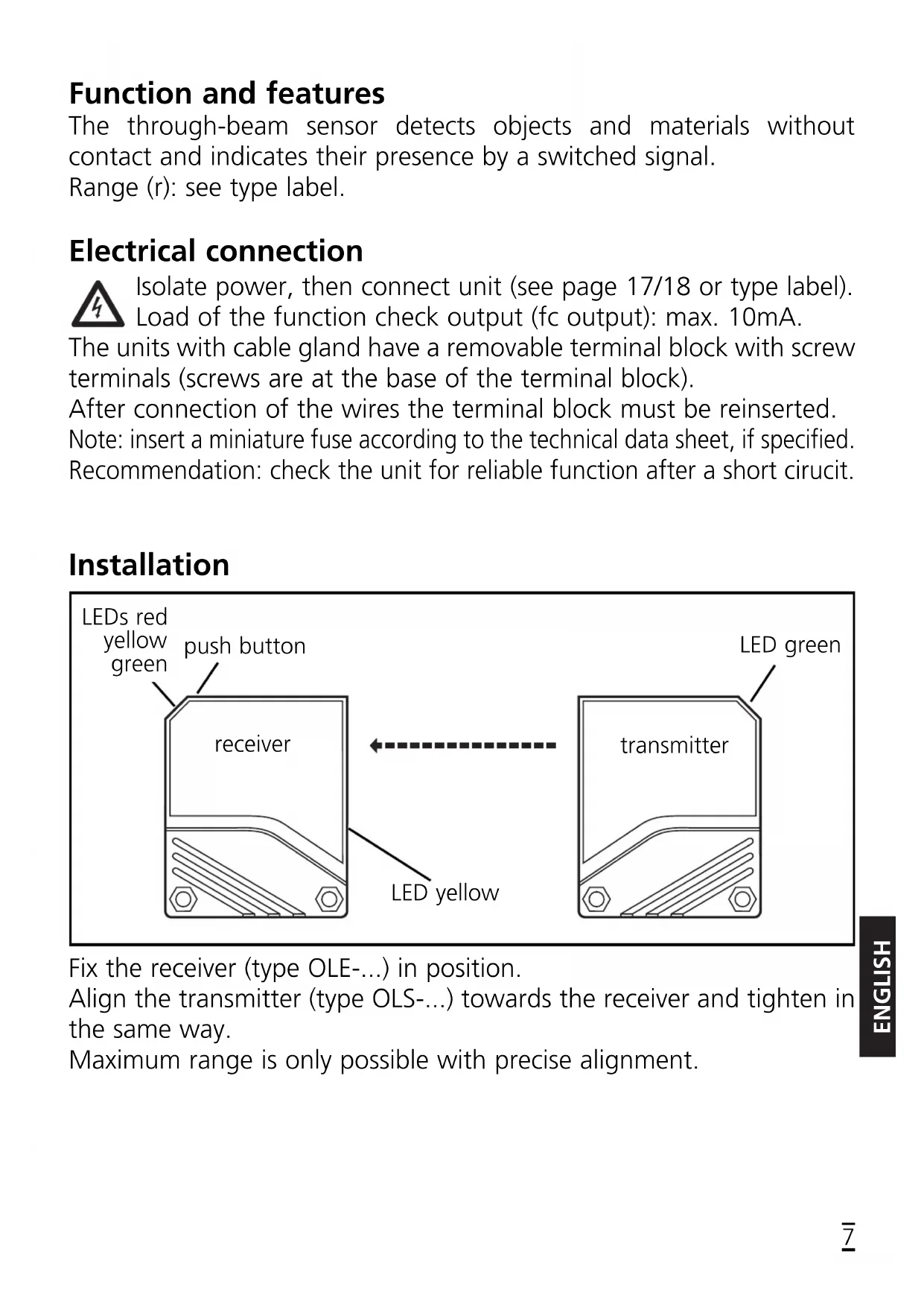 During the measurement (about 1s) allow at least two objects to move through the detection area. receiver transmitter receiver transmitterENGLISH Programming the output function Operation Check the safe functioning of the unit. Display by LEDs and by the fun- ction check output. Function check output (only for sensors with DC power supply)
