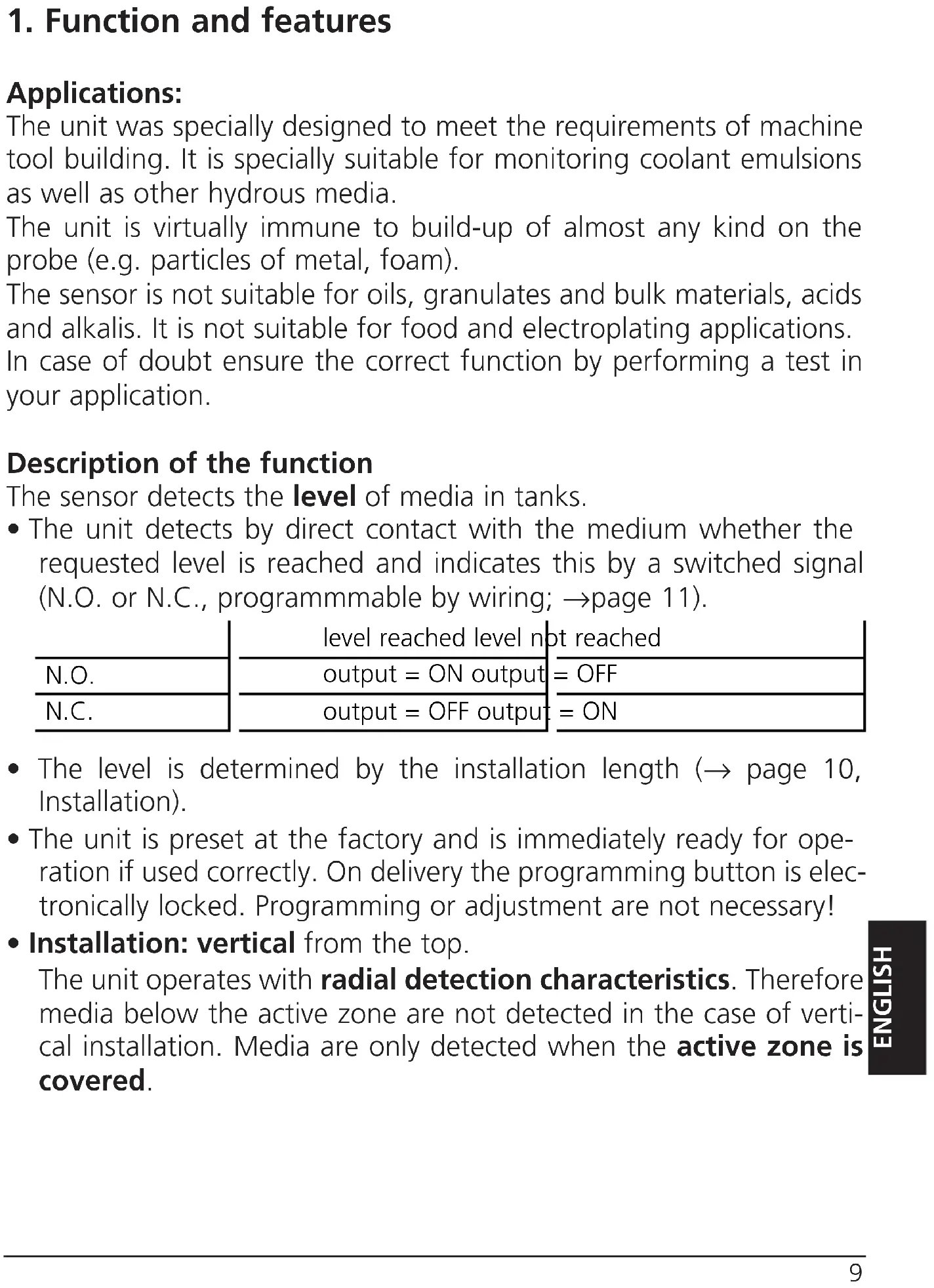 - The unit detects by direct contact with the medium whether the requested level is reached and indicates this by a switched signal (N.O. or N.C., programmable by wiring; page 11).
