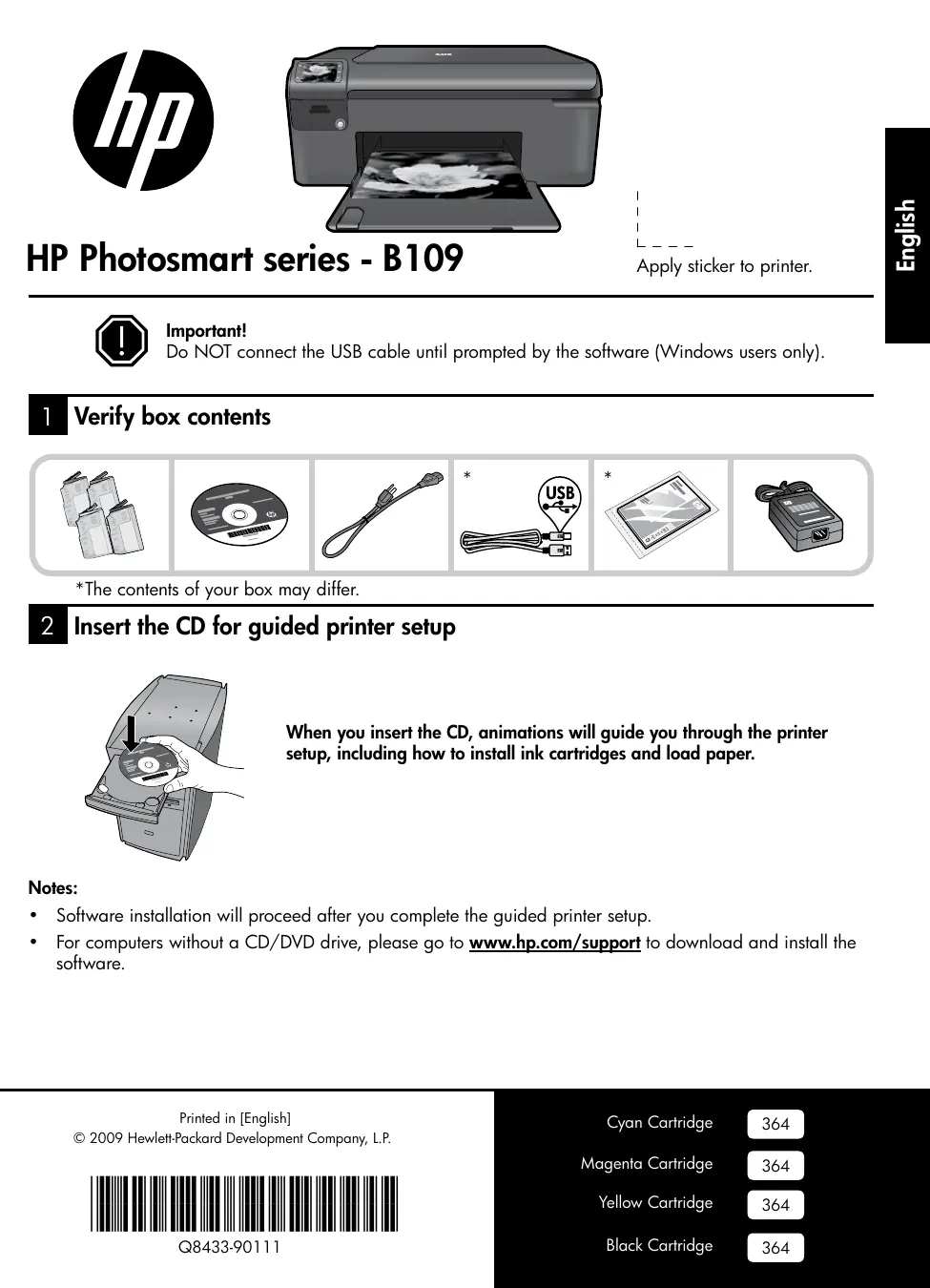 • Software installation will proceed after you complete the guided printer setup. • For computers without a CD/DVD drive, please go to www.hp.com/support to download and install the software.
