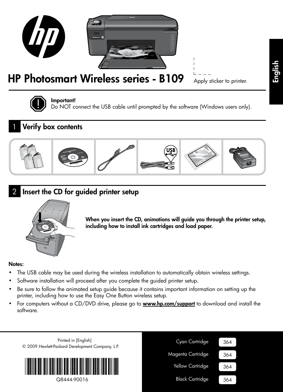 • The USB cable may be used during the wireless installation to automatically obtain wireless settings. • Software installation will proceed after you complete the guided printer setup. • Be sure to follow the animated setup guide because it contains important information on setting up the printer, including how to use the Easy One Button wireless setup. • For computers without a CD/DVD drive, please go to www.hp.com/support to download and install the software.