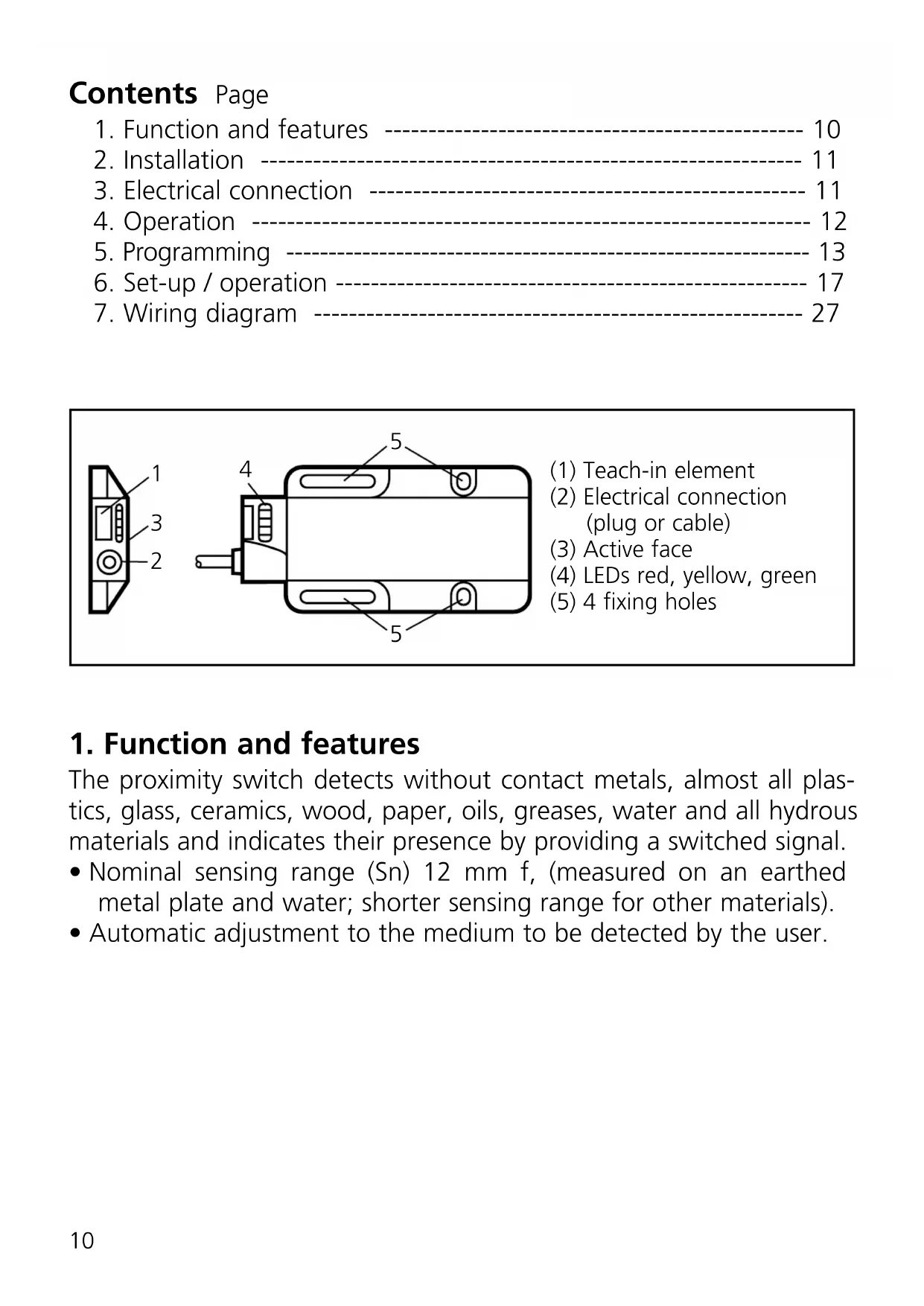 (1) Teach-in element (2) Electrical connection (plug or cable) (3) Active face (4) LEDs red, yellow, green (5) 4 fixing holesENGLISH