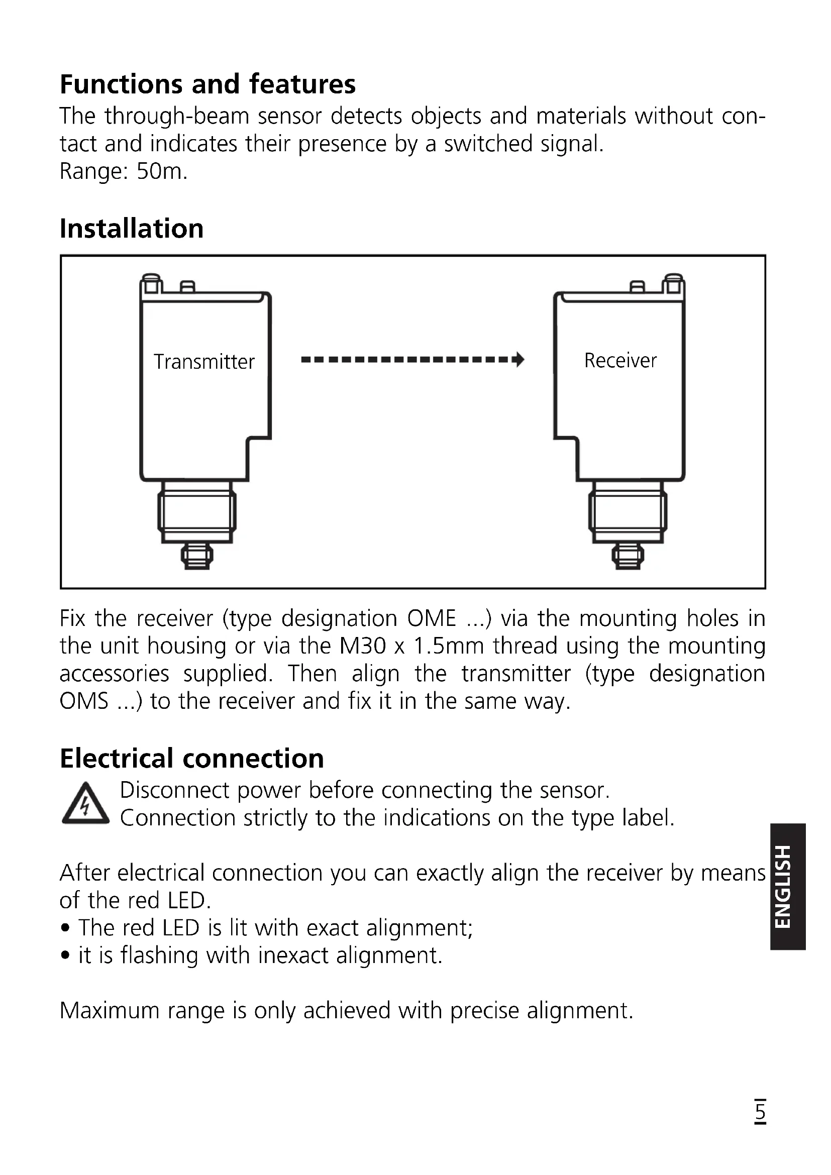 Light Dark Function Check Range Function display Output Yellow LED Function Check Red LED On Green LED Range Potentiometer for sensitivity setting Slide switch for the light-on or dark- on operating modes For setting loosen the screw and open the housing coverENGLISH Test input of the transmitter (only for DC units) By activating the test input (test at L-) the transmitter is deactivated. When no object is in the light beam between transmitter and receiver the LEDs indicating the reception of light must go off and the switch- ing state of the output must change. Operation Only open the cover to make adjustments. Close it after the adjust- ment has been made in order to maintain the protection IP67. Check whether the unit functions properly.